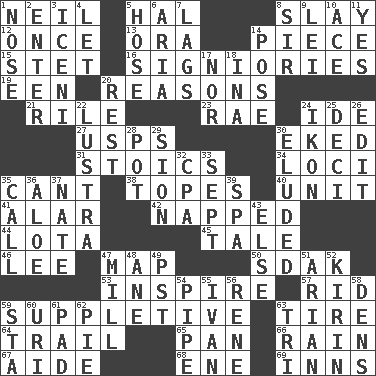 ACROSS 1. Famous astronaut Armstrong 5. Actor Linden 8. Kill 12. Single time 13. Mouth or opening 14. Component 15. Proofreading order 16. Seigniories (variant) 19. Car or cant ending 20. Thinks logically 21. Cause heat under the collar 23. Actress Charlotte 24. Binary compound 27. United States Postal Service (abbr.) 30. Supplemented with great effort 31. Unemotional ones 34. Event scenes 35. Patter 38. Drinks excessively 40. A single undivided whole 41. Having or resembling wings 42. Slept 44. Globular water bottle used in Asia 45. Falsehood 46. Area sheltered from the wind 47. Atlas unit 50. Neighbor of Neb. 53. Motivate 57. To free from 59. Supplying deficiencies 63. Become fatigued 64. Drop behind 65. Baking dish 66. Precipitation 67. Assistant 68. Compass dir. 69. Restaurants DOWN 1. Olfactory organ 2. Keyboard key 3. Ancient Celtic tribe of eastern Britain 4. Allow 5. Flexible conduit 6. Roberta Peters solo 7. Fails to keep up a pace 8. Title for a knight 9. Flowery wreath 10. Adept person 11. Affirmative reply 14. Introduce or present, as a question 17. Not either 18. _ tizzy (2 wds.) 20. Respite 22. A period of five years 24. Picture 25. Tenth: prefix 26. Prepare for publication 28. Plant holder 29. The Jewish people; Israel 30. Dodged 32. Numbers guy (abbr.) 33. Back-to-school mo. 35. Give a ring to 36. _ vera 37. Nathan's nickname 39. Health resort 43. Otherwise 47. Place where flour is made 48. One (Scot) 49. Pacific Standard Time (abbr.) 51. Believer in; advocate of (suffix) 52. Japanese brewing company 54. Corncob 55. "Terrible" tsar 56. French philosopher Descartes 58. Lairs 59. R.R. building 60. RI univ. 61. Groovy apt. 62. Sliced dessert 63. Three (prefix)