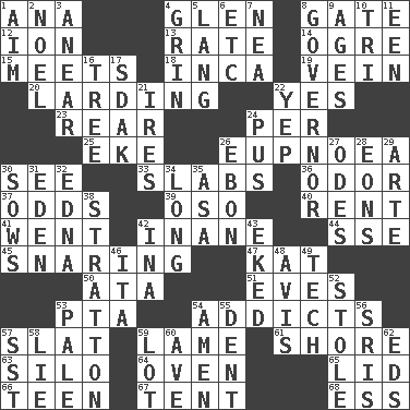 ACROSS 1. Santa ___, CA 4. Small, secluded valley 8. Yard entry 12. Electrically charged atom 13. Assign a rank or rating to 14. Legendary monster 15. Confronts 18. South American Indian 19. Distinctive style or manner 20. Preparing or cooking with lard 22. It is so 23. Hitchcock's "____ Window" 24. For each 25. Make supply last 26. Normal relaxed breathing 30. Observe 33. Thick slices 36. Aroma 37. Probability 39. Bear (Spanish) 40. Monthly bill 41. Gone 42. Lacking in sense or substance 44. Compass dir. 45. Catching in a trap 47. Krazy ___ of comics 50. _ moment's notice (2 wds.) 51. Nights before holidays 53. Parent Teacher Assoc. 54. Inveterate users 57. Narrow board 59. Unable to walk 61. Dinah or Pauly 63. Grain storage tower 64. Baking chamber 65. Hat (slang) 66. Adolescent 67. Portable shelter 68. Curvy letter DOWN 1. Direct toward a target or goal 2. Christmas carol 3. Approach 4. Broad smile 5. Long (Scottish) 6. And so on (abbr.) 7. Teachers' org. 8. State head 9. Ripens 10. Three (prefix) 11. Car or cant ending 16. Relationship diagram 17. Neighbor of Neb. 21. Angers 22. Slangy assent 24. Product of festering 26. Inky black, to poets 27. Lyric poems 28. Immeasurably long periods of time 29. Johnson of "Laugh-In" 30. Sty mamas 31. Locale of original sin 32. Pulitzer Prize-winning author Ferber 34. Protracted 35. White ___ sheet 38. Ski resort town in Vermont 42. _ tizzy (2 wds.) 43. Made supply last 46. Call ___ day 48. Deliberation 49. Georgia ____ (Atlanta school) 52. Took without asking 53. Light colored 54. So be it 55. Gouge 56. Indian titles of respect 57. Fast jet (abbr.) 58. Falsehood 59. Car dealer's back yard 60. "___ Maria" 62. Begley and Asner
