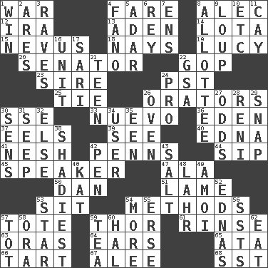 ACROSS 1. Armed conflict 4. Conductor's collection 8. Actor Baldwin 12. Retirement account (abbr.) 13. An important port of Yemen 14. Globular water bottle used in Asia 15. Mole, birthmark 18. Negative votes 19. "I Love _" 20. Elected representative 22. Grand Old Party 23. Father 24. Pacific Standard Time (abbr.) 25. Standoff 26. Speakers 30. Compass dir. 33. New (sp.) 36. Locale of original sin 37. Snakelike fish 39. Observe 40. Pulitzer Prize-winning author Ferber 41. Delicate 42. Actor Sean's family 44. Small drink 45. Orator 47. According to 50. One of the 12 tribes of Israel 51. Unable to walk 53. Be seated 54. Modes 57. Haul 59. Son of Odin 61. Remove soap 63. Mouths or openings 64. Hearing organs 65. "One Day ___ Time" 66. Small pie 67. Toward shelter 68. Fast jet (abbr.) DOWN 1. Victory 2. Ancient Greek god of war 3. All-night dance parties 4. Papal veil 5. The sixth month of the Jewish calendar 6. Marina Del _, California 7. Followers of ems 8. One to whom something is allotted 9. Central Nebraska county 10. And so on (abbr.) 11. Island 16. A single undivided whole 17. Indian skirt 21. Adolescent 22. Girls' org. (abbr.) 24. Adept person 26. Baking chamber 27. Likelihood 28. Painter Guido (1575-1642) 29. Fastener 30. Elected reps. 31. Ooze 32. Otherwise 34. One who makes use of a thing 35. Car or cant ending 38. Most dubious of character or honesty 42. Writing instrument 43. Table seasoning 46. Krazy ___ of comics 48. Cowardly lion portrayer 49. Mine, in Marseilles 52. Ferber et al. 53. Play the lead 54. Greater amount 55. Celtic language 56. Fast planes 57. Small child 58. Mouth or opening 59. Afternoon social gathering 60. Actor Linden 62. Ingest