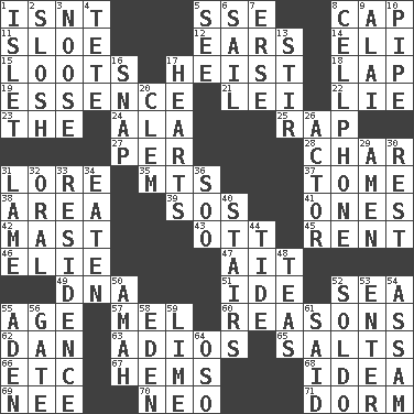 ACROSS 1. Is not 5. Compass dir. 8. Head covering 11. A type of plum 12. Hearing organs 14. Biblical high priest 15. Plunders 17. Robbery 18. Pet locale 19. Gist 21. Luau accessory 22. Falsehood 23. Definite Article 24. Insect wing 25. Strike 27. For each 28. Burn to charcoal 31. Old wives' tales, e.g. 35. Mountains (abbr.) 37. Heavy book 38. Length times width 39. Mayday 41. Washington bills 42. Vertical spar for supporting sails 43. Baseball player Mel 45. Monthly bill 46. Writer Wiesel 47. Small island 49. Heredity factor (abbr.) 51. Binary compound 52. Ocean 55. Mature 57. Cartoonist voice _ Blanc 60. Thinks logically 62. One of the 12 tribes of Israel 63. Goodbye (Sp.) 65. Table seasonings 66. And so on (abbr.) 67. Cloth borders 68. It may be bright or harebrained 69. Born 70. Modern: prefix 71. Dormintory (informal) DOWN 1. Small island 2. Splash clumsily 3. Trap for birds or small mammals 4. False hair 5. Perceive with the eye 6. Travel by water 7. Celtic language 8. Portable communications device 9. Jai _ 10. Corncob 13. Move through with a circular motion 16. Fastener 17. Centers of feelings and intuitions 20. Clement's nick name 26. Thespian 29. So be it 30. Remainder 31. Unable to walk 32. Spoken 33. Dwelling 34. Ingested 36. "Barney Miller" actor Jack 40. Flight of steps 44. Event that recurs at intervals 48. Beverages made from leaves 50. Nursemaid 52. Twentieth part of a lira 53. Keyboard key 54. Indian state 55. An important port of Yemen 56. Yard entry 58. Locale of original sin 59. Citrus frut 61. Alleged 64. Bear (Spanish)