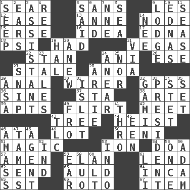 ACROSS 1. Dry up 5. Without 9. French article 12. Comfort 13. Queen of England 1702-14 14. Connecting point 15. Celtic language 16. It may be bright or harebrained 17. Pulitzer Prize-winning author Ferber 18. Air pressure measure (abbr.) 19. Possessed 21. Viva Las _ 22. Comedian Laurel of Laurel & Hardy 24. Cuckoo 26. Compass dir. 27. Showing deterioration from age 28. Small Philippine buffalo 29. Of or related to the anus 30. One who wires 32. Global Positioning Systems (abbr.) 36. Trig term 37. R.R. building 38. Johnson of "Laugh-In" 39. Flats, for short 40. Talk or behave amorously 42. Confront 43. Family _ (genealogy) 44. Robbery 46. "One Day ___ Time" 49. Car dealer's back yard 50. Painter Guido (1575-1642) 51. Mysterious quality of enchantment 53. Electrically charged atom 54. ___ good deed 57. So be it 58. Style 61. Grant temporary use of 62. Transmit 63. Old (Scot.) 64. South American Indian 65. Fast jet (abbr.) 66. Printing process, for short 67. A distinct part DOWN 1. Ooze 2. Hearing organs 3. Helper 4. Portuguese money of account (variant) 5. Expressed in words 6. Added to 7. Compass dir. 8. Ocean 9. Cabin 10. Ferber et al. 11. Gospel singer Marvin 14. Born 19. Actor Linden 20. Afresh 21. By way of 23. Lies 24. Approach 25. And not 27. Clip 28. Nick name for Arthur 29. White ___ sheet 31. Small island 32. Homeless child 33. Elected leader of a country 34. Proofreading order 35. Put into a specified state 40. Away 41. Through, poetically 43. Affectionate concern, for short 45. Car or cant ending 46. Collect or gather 47. Domesticates 48. Representative 52. Indiana (abbr.) 53. _ china 55. Single time 56. First man 58. Hearing organ 59. Nilotic language 60. The first octave above the treble staff 61. Cards in a Roman deck?