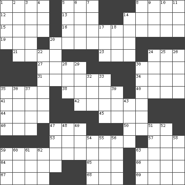 ACROSS 1. Central Nebraska county 5. Third day of the wk. 8. Needle case 12. Legendary monster 13. White ___ sheet 14. Robbery 15. Having or resembling wings 16. Dwellings 19. Remaining after all deductions 20. Mood resulting from idleness 21. Tenth: prefix 23. Curvy letter 24. Symbol (abbr.) 27. Unable to walk 30. Polynesian shrub of the pepper family 31. Michaelmas daisies 34. Ancient Greek god of war 35. Comedian Laurel of Laurel & Hardy 38. Narrow boards 40. Political cartoonist Thomas 41. Long (Scottish) 42. Soup utensils 44. Matures 45. Small Philippine buffalo 46. Compass dir. 47. Atlas unit 50. Russian ruler of old 53. Stimulate to action 57. Storage container 59. Supplying deficiencies 63. Event that recurs at intervals 64. Drop behind 65. Baking dish 66. Lyric poems 67. Helper 68. Conclude 69. Trial DOWN 1. Grant temporary use of 2. Stared at amorously 3. A salt of uric acid 4. For each 5. Pacific island yam 6. One who uses or employs something 7. Comfort 8. Car or cant ending 9. Nervous spasm 10. Purpose 11. It is 14. Is hesitant and indecisive 17. Binary compound 18. Two (Sp.) 20. Prejudice 22. Gives out a loud, resonant sound 24. "Two Mules for Sister ____" 25. Jacques Cousteau's middle name 26. Vertical spar for supporting sails 28. Mountains (abbr.) 29. Snakelike fish 30. Sunflower state 32. Reproach for some lapse or misdeed 33. Portico 35. Cole _ (cabbage dish) 36. Labels 37. Afresh 39. Manchild 43. Make mention of 47. Place where flour is made 48. One (Scot) 49. Pacific Standard Time (abbr.) 51. Stay 52. Amusement-park features 54. Corncob 55. _ the terrible 56. Tear apart 58. Egg locale 59. R.R. building 60. RI univ. 61. Groovy apt. 62. Sliced dessert 63. Small child