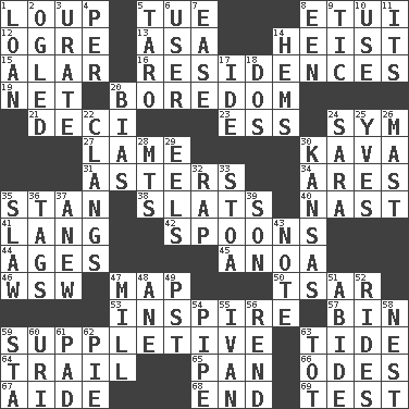 ACROSS 1. Central Nebraska county 5. Third day of the wk. 8. Needle case 12. Legendary monster 13. White ___ sheet 14. Robbery 15. Having or resembling wings 16. Dwellings 19. Remaining after all deductions 20. Mood resulting from idleness 21. Tenth: prefix 23. Curvy letter 24. Symbol (abbr.) 27. Unable to walk 30. Polynesian shrub of the pepper family 31. Michaelmas daisies 34. Ancient Greek god of war 35. Comedian Laurel of Laurel & Hardy 38. Narrow boards 40. Political cartoonist Thomas 41. Long (Scottish) 42. Soup utensils 44. Matures 45. Small Philippine buffalo 46. Compass dir. 47. Atlas unit 50. Russian ruler of old 53. Stimulate to action 57. Storage container 59. Supplying deficiencies 63. Event that recurs at intervals 64. Drop behind 65. Baking dish 66. Lyric poems 67. Helper 68. Conclude 69. Trial DOWN 1. Grant temporary use of 2. Stared at amorously 3. A salt of uric acid 4. For each 5. Pacific island yam 6. One who uses or employs something 7. Comfort 8. Car or cant ending 9. Nervous spasm 10. Purpose 11. It is 14. Is hesitant and indecisive 17. Binary compound 18. Two (Sp.) 20. Prejudice 22. Gives out a loud, resonant sound 24. "Two Mules for Sister ____" 25. Jacques Cousteau's middle name 26. Vertical spar for supporting sails 28. Mountains (abbr.) 29. Snakelike fish 30. Sunflower state 32. Reproach for some lapse or misdeed 33. Portico 35. Cole _ (cabbage dish) 36. Labels 37. Afresh 39. Manchild 43. Make mention of 47. Place where flour is made 48. One (Scot) 49. Pacific Standard Time (abbr.) 51. Stay 52. Amusement-park features 54. Corncob 55. _ the terrible 56. Tear apart 58. Egg locale 59. R.R. building 60. RI univ. 61. Groovy apt. 62. Sliced dessert 63. Small child