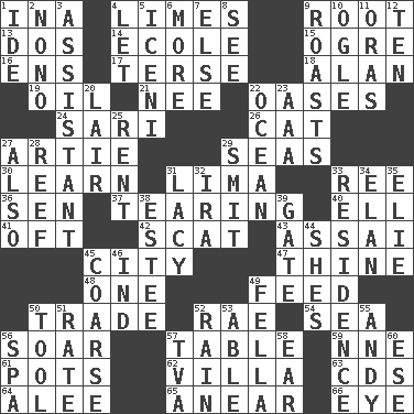 ACROSS 1. _ tizzy (2 wds.) 4. Citrus fruits 9. Carrot, for example 13. Two (Sp.) 14. Learning spot: Fr. 15. Legendary monster 16. Followers of ems 17. Laconic 18. Actor Alda or Thicke 19. Petroleum 21. Born 22. Fertile tracts in a desert 24. Indian skirt 26. Feline 27. Nick name for Arthur 29. Oceans 30. Acquire or gain knowledge or skills 31. Pale green bean 33. Portuguese money of account (variant) 36. Elected rep. 37. Lacerating 40. Pipe bend 41. Often (poetically) 42. Go away! 43. Slender Brazilian palm 45. Municipality 47. One or ones belonging to thee 48. Single 49. Nourish 50. Exchange 52. Actress Charlotte 54. Ocean 56. Fly high 57. Eating place 59. Compass dir. 61. Cooking vessels 62. Country residence 63. Music discs 64. Toward shelter 65. Approach 66. Sight organ DOWN 1. Binary compound 2. Words to Nanette 3. Helper 4. Allow 5. Ancient Celtic tribe of eastern Britain 6. Greater amount 7. Otherwise 8. Observe 9. Ridicules or criticizes harshly 10. Stare at amorously 11. Mouths or openings 12. "___ Little Indians" 20. Den 22. Sea 23. American Automobile Association (abbr.) 25. Monthly bill 27. In addition 28. Coral ridge 29. Stricken, poetically 31. Made of lace 32. Lyricist Gershwin 33. Home 34. Style 35. Writer Wiesel 38. First name in cosmetics 39. Yard entry 44. "______ My Girl" (Turtles hit) 45. Rough 46. Working for oneself (abbr.) 49. Chap (slang) 50. Instrument 51. Assign a rank or rating to 52. Water falling in drops from the sky 53. Competent 55. "60 Minutes" Commentator Rooney 56. Health resort 57. Federal power corp. 58. Hearing organ 60. Compass dir.
