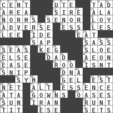 ACROSS 1. Penny 5. Shoshoni 8. Small boy 11. Length times width 12. Male parent of an animal 14. Wing 15. Typical models 17. Sir (Sp.) 18. Myrna of the movies 19. Contrary to your interests or welfare 21. Curvy letter 22. French article 23. Area sheltered from the wind 24. Binary compound 25. Ingest 27. Plant excrement 28. Backtalk 31. Oceans 35. Barrel 37. A type of plum 38. Otherwise 39. June honoree 41. Period of immesurable duration 42. Comfort 43. Friend of Pooh 45. Is not 46. Clip 47. Heredity factor (abbr.) 49. Symbol (abbr.) 51. Set 52. Eastern Standard Time (abbr.) 55. Fish or hair follower 57. Keyboard modifier key 60. Substance 62. _ moment's notice (2 wds.) 63. Long dresses 65. Fertile tracts in a desert 66. Player for Phoenix 67. SW Asia republic 68. Undersized animal 69. Teat (slang) 70. Compass dir. 71. Arranges properly for use DOWN 1. Lessep's creation 2. Wear away 3. Boldness 4. Not wild 5. Purpose 6. Prong on a fork 7. Greek god of love 8. Baron Munchausen's specialties 9. _ vera 10. 24-hour periods 13. Celtic language 16. Indian titles of respect 17. Oozed 20. Neighbor of Neb. 26. Slender Brazilian palm 29. Within a short period 30. Emitted 31. Perceives with the eye 32. Style 33. Aide 34. Not well drained, as in land 36. Slender fish 40. Evades 44. Washington bills 48. In addition 50. Wise men 52. Follow as a consequence or result 53. Odor 54. Trials 55. Political cartoonist Thomas 56. Needle holder 58. Old wives' tales, e.g. 59. It was, poetically 61. Hearing organs 64. Compass dir.