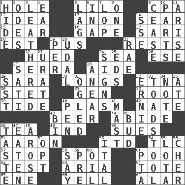 ACROSS 1. Hollow 5. _ and Stitch 9. Accounting whiz (abbr.) 12. The content of cognition 13. At once, immediately (arch.) 14. Dry up 15. Letter starter 16. Yawn 17. Indian skirt 18. Eastern Standard Time (abbr.) 19. Product of festering 21. Musical pauses 22. Became colored 24. Ocean 26. Compass dir. 27. Spanish missionary in California 28. Helper 29. "Two Mules for Sister ____" 30. Yearns 32. Inactive volcano in Sicily 36. Proofreading order 37. Commissioned military rank (abbr.) 38. Carrot, for example 39. Event that recurs at intervals 40. Suffix with ecto or cyto 42. Nathan's nickname 43. Fermented drink made from hops 44. Stay 46. Beverage made from leaves 49. Indiana (abbr.) 50. Takes to court 51. Composer Copland 53. It would 54. Affectionate concern, for short 57. Obstruct or block passage 58. Blemish 61. "Silly old bear" 62. Trial 63. Operatic vocal solo 64. Carryall 65. Compass dir. 66. Shout 67. Having or resembling wings DOWN 1. Flintstone garb 2. Lyric poems 3. Tough but pliablecoriaceous 4. Ewer handle 5. Fails to keep up a pace 6. _ tizzy (2 wds.) 7. Trim (branches) 8. Single 9. Desist 10. Components 11. Ascend 14. Compass dir. 19. For each 20. Allodial 21. Actress Charlotte 23. A salt of uric acid 24. Signals 25. Begley and Asner 27. Suttee (variant) 28. Approach 29. Fast jet (abbr.) 31. Stared 32. Bert's buddy 33. Inedible or poisonous agaric 34. Make mention of 35. Had dinner 40. Writing instrument 41. Vertical spar for supporting sails 43. Storage container 45. Partially opened flower 46. Clothes sense 47. Eroded 48. Came up 52. Choose 53. Slanted text style (abbr.) 55. Globular water bottle used in Asia 56. "Mermaids" star 58. Declare 59. Before (prefix) 60. Petroleum 61. Parent Teacher Assoc.