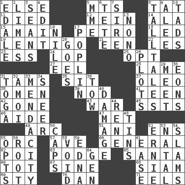 ACROSS 1. Otherwise 5. Mountains (abbr.) 8. Make lace 11. Passed on 12. Count _ (2 wds.) 14. In the manner of 15. With great haste 17. Stone: prefix 18. Directed 19. Small, flat, pigmented spot on the skin 21. Car or cant ending 22. French article 23. Double-curved letter 24. Trim (branches) 25. Elect 27. Snakelike fish 28. Unable to walk 31. Scottish caps 35. Be seated 37. Butter sub 38. Sign of things to come 39. Allow head to fall sleepily 41. Adolescent 42. Went 43. Armed conflict 45. Fast planes 46. Helper 47. Was introduced to 49. Curve 51. Black tropical American cuckoo 52. Followers of ems 55. The grampus (Milton) 57. "___ Maria" 60. Commissioned military rank 62. Luau course 63. Porridge 65. Before Barbara or Clara 66. Small child 67. Trig term 68. Thailand, formerly 69. Filthy place 70. Daniel's nick name 71. Snakelike fish DOWN 1. Peak District village in England 2. Citrus fruits 3. Actors Connery and Penn 4. Prepare for publication 5. Madame (abbr.) 6. Wig 7. Father 8. Baron Munchausen's specialties 9. Toward shelter 10. Small amounts or degrees 13. Words to Nanette 16. "Death on the ____" 17. Cotton for raincoats, e.g. 20. Moves 26. Graphs 29. Confront 30. Immeasurably long periods of time 31. Ancient Roman robe 32. Mine, in Marseilles 33. Ananias' fault 34. Scornful expression 36. Pull behind 40. Break 44. French philosopher Descartes 48. Canisters 50. Balmoral and tarboosh 52. Bert's buddy 53. Relating to or accompanying birth 54. Shuts with force 55. Elects 56. Carrot, for example 58. Lacking any legal or binding force 59. Pulitzer Prize-winning author Ferber 61. Comfort 64. Commissioned mil. rank