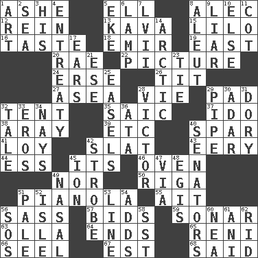 ACROSS 1. American tennis player Robert 5. Pipe bend 8. Actor Baldwin 12. It's straight from the horse's mouth 13. Polynesian shrub of the pepper family 15. _ and Stitch 16. Clothes sense 18. Independent ruler or chieftain 19. Compass direction 20. Actress Charlotte 22. Photo 24. Celtic language 26. Teat (slang) 27. At sea 28. Compete 29. Groovy apt. 32. Portable shelter 35. Ketch in the Levant 37. Wedding promise 38. Like ___ of sunshine 39. And so on (abbr.) 40. Coast Guard woman 41. Myrna of the movies 42. Narrow board 43. Suggestive of the supernatural 44. Curvy letter 45. ___ a Wonderful Life 46. Baking chamber 49. Not either 50. Capital of Latvia 51. Player piano 55. Small island 56. Backtalk 57. Auction offers 59. Underwater navigation system 63. Water jar 64. Extremities 65. Painter Guido (1575-1642) 66. Sew up the eyelids of hawks and falcons 67. Eastern Standard Time (abbr.) 68. Stated DOWN 1. Nonscientific branch of learning 2. Ocean 3. Part of HMS, perhaps 4. Plea 5. Supplement with great effort 6. Desk light 7. 57 in ancient Rome 8. Eskimo relative 9. One who doesn't tell the truth 10. Otherwise 11. Small bed 14. Northern region 17. Hearing organs 21. Compass dir. 23. Standoff 25. Artist's stands 28. Winning man's name 29. Corncob 30. The sixth month of the Jewish calendar 31. Small, narrow, flatbottom fishing boat 32. Story 33. Greek god of love 34. Negative votes 36. "One Day ___ Time" 40. Legislators 42. Disco prop 45. Electrically charged atom 47. By way of 48. The front part of a cuirass 49. Relating to the nose 51. Diluted with white 52. Small island 53. Actor's bit 54. Sums up 56. Distress signal 58. Fast jet (abbr.) 60. Teachers' org. 61. Black tropical American cuckoo 62. To free from