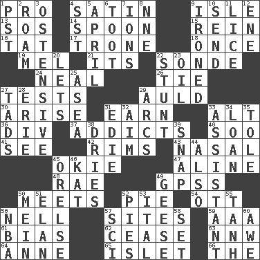 ACROSS 1. Adept person 4. Smooth fabric 9. Small island 13. Mayday 14. Soup utensil 15. It's straight from the horse's mouth 16. Make lace 17. Marketplace scale 18. At one time in the past 19. Cartoonist voice _ Blanc 21. It is 22. Something which is sent 24. Anneal 26. Make a knot 27. Trials 29. Old (Scot.) 30. Ascend 31. Merit 33. Keyboard modifier key 36. HTML Container Element 37. Inveterate users 40. "Barney Miller" actor Jack 41. Observe 42. Basketball hoops 43. Rhinal 45. Migrant worker of the '30s 47. Place in a line 48. Actress Charlotte 49. Global Positioning Systems (abbr.) 50. Confronts 52. Sliced dessert 54. Baseball player Mel 56. 1994 drama film starring Jodie Foster 57. Locates 59. Auto club (abbr.) 61. Prejudice 62. Stop 63. Compass dir. 64. Queen of England 1702-14 65. Small island 66. Definite Article DOWN 1. Pacific Standard Time (abbr.) 2. Wander aimlessly 3. Clearly or manifestly demonstrative 4. Fast jet (abbr.) 5. Showery time 6. A blast of a horn 7. Charged particles 8. Compass dir. 9. Pressed 10. Transmit 11. Louse (plural) 12. Compass dir. 20. Allows 22. Difficult or unusual or dangerous feat 23. Lubricate 25. Toward the sea 27. Small boys 28. One of the Great Lakes 29. Arches 31. Singer Brickell 32. Direct toward a target or goal 33. Helper 34. Grant temporary use of 35. Lacquered or enameled metalware 38. Frees from moisture 39. Fastener 44. In addition 45. Threatening words 46. Krazy ___ of comics 49. Honkers 50. Count _ (2 wds.) 51. Flair 52. Sliced desserts 53. Slanted text style (abbr.) 55. Hyperbolic tangent 56. Basketball assoc. 57. _-fi 58. Arrange properly for use 60. Deep reverence