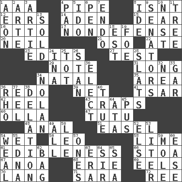 ACROSS 1. Auto club (abbr.) 4. Corncob 8. Is not 12. Blunders 14. Arabian gulf 15. Letter starter 16. "Beetle Bailey" pooch 17. Unrelated to defense, as in spending 20. Famous astronaut Armstrong 21. Bear (Spanish) 22. Had dinner 23. Prepares for publication 27. Trial 29. Short letter 31. Protracted 34. Relating to or accompanying birth 35. Length times width 36. Redecorate 39. Remaining after all deductions 41. Russian ruler of old 42. The bottom of a shoe or boot 43. Dice game 46. Water jar 47. Ballerina skirt 48. Of or related to the anus 51. Artist's stand 54. Soggy 56. Lion 58. Citrus frut 61. The property of being fit to eat 66. Portico 67. Small Philippine buffalo 68. 4th largest of the Great Lakes 69. Snakelike fish 70. Austrian-born American filmmaker Fritz 71. "Two Mules for Sister ____" 72. Portuguese money of account (variant) DOWN 1. A really long time 2. Johnson of "Laugh-In" 3. Nick name for Arthur 4. Baking dish 5. Wedding promise 6. Writing instrument 7. Inside; within (prefix) 8. Binary compound 9. Legislators 10. Political cartoonist Thomas 11. Woody plant 13. Disposed of to a purchaser 18. Eastern Standard Time (abbr.) 19. Enemy 24. _ tizzy (2 wds.) 25. Small child 26. Comedian Laurel of Laurel & Hardy 28. Narrow boards 30. Voters do this 32. Teachers' org. 33. Slender fish 34. Pitcher Ryan 36. 17th letter of the Greek alphabet 37. Snakelike fish 38. Accusation by an informer 40. Loyal 44. _ moment's notice (2 wds.) 45. Fluid product of inflammation 49. 100% 50. Area sheltered from the wind 52. Otherwise 53. 61 cubic inches 54. Welt 55. Pulitzer Prize-winning author Ferber 57. Washington bills 59. Undercover agent 60. Comfort 62. Paper or plastic container 63. Period 64. Title for a knight 65. Ocean