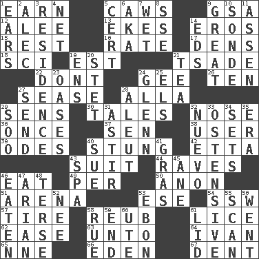 ACROSS 1. Merit 5. Crow sounds 9. Girls' org. (abbr.) 12. Toward shelter 13. Makes supply last 14. Greek god of love 15. Repose 16. Pace 17. Hiding places for outlaws 18. _-fi 19. Eastern Standard Time (abbr.) 21. Sadhe (variant) 22. Do not 24. Unit of force equal to gravity 26. "___ Little Indians" 27. Gospel singer Marvin 28. Silent film actress Nazimova 29. Elected reps. 30. Falsehoods 32. Characteristic smell of wine 36. Single time 37. Elected rep. 38. One who makes use of a thing 39. Lyric poems 40. Feeling sharp psychological pain 42. Singer James 43. Costume for a special activity 44. All-night dance parties 46. Erode 49. For each 50. Soon (poet.) 51. Sports stadium 53. Compass dir. 54. Compass dir. 57. Become fatigued 58. Reuben's nickname 61. Louse (plural) 62. Relaxation 63. To (old English) 64. _ the terrible 65. Compass dir. 66. Genesis locale 67. Undesirable depression on a surface DOWN 1. Hearing organs 2. Actor Baldwin 3. Home 4. Fish or hair follower 5. An absolute certainty 6. Alias (abbr.) 7. Soggy 8. Compass dir. 9. Relatively large 10. Something which is sent 11. NE Netherlands city 14. Begley and Asner 19. Followers of ems 20. Proofreading order 21. Afternoon social gathering 23. Fertile tracts in a desert 24. American astronaut and politician John 25. Raised railways 27. Transmit 28. Eskimo relative 29. "Barney Miller" actor Jack 31. Moving about 32. New (sp.) 33. Clearly or manifestly demonstrative 34. Puts into a specified state 35. Epoch 40. Institute legal proceedings 41. Pate de foie ____ 43. Health resort 45. A saturated hydrocarbon 46. Ingested 47. Believer in; advocate of (suffix) 48. Laconic 52. Born 53. Inky black, to poets 55. Skim 56. Gone 58. Sorrow 59. Conclude 60. Shoshoni 61. Hat (slang)