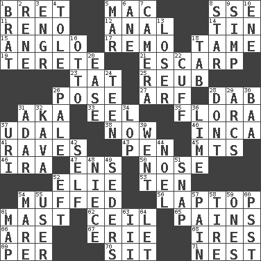 ACROSS 1. Cy Young winner Saberhagen 5. Apple computer (short form) 8. Compass dir. 11. Western Nevada city 12. Of or related to the anus 14. Metal container 15. White American of non-Hispanic descent 17. San ____ (Riviera town) 18. Docile 19. Cigar-shaped 21. Fortification 23. Make lace 25. Reuben's nickname 26. Airs 27. Sandy's bark 28. Small moist lump or mass 31. Alias (abbr.) 33. Snakelike fish 35. Plants 37. Freehold land 38. Immediately 40. South American Indian 41. All-night dance parties 43. Writing instrument 45. Mountains (abbr.) 46. Lyricist Gershwin 47. Followers of ems 50. Sense of smell 52. Writer Wiesel 53. Nine, plus one 54. Performed or handled clumsily 56. Portable computer 61. Vertical spar for supporting sails 62. To provide with a ceiling 65. Aches 66. "We ___ not amused" (Victoria) 67. One of the Great Lakes 68. Angers 69. For each 70. Be seated 71. A home for chicks DOWN 1. Naughty child 2. French philosopher Descartes 3. Engineer (abbr.) 4. Lacquered or enameled metalware 5. Spoil 6. A saturated hydrocarbon 7. Device for capturing images 8. Play the lead 9. Simple or foolish person 10. Compass dir. 13. Failure 16. "Beetle Bailey" pooch 18. Bar bill 20. Relaxation 22. _ links 24. Adolescent 26. Diluted with white 28. Do not 29. Arches 30. Sound made by sheep 31. The sixth month of the Jewish calendar 32. Polynesian shrub of the pepper family 34. Chop off 36. Citrus frut 37. RI univ. 39. Left 42. Automatically 44. Christmas carol 48. Sibling's daughter 49. Spring feasts 51. Fastener 52. Bank Draft (abbr.) 54. Female horse 55. One who makes use of a thing 57. Ache 58. Become fatigued 59. Singles 60. Inconspicuous attention getter 61. Atlas unit 63. One more than two 64. Allow