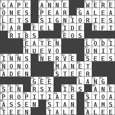 ACROSS 1. Yawn 5. Queen of England 1702-14 9. We are 13. Singles 14. Lightbulb-shaped fruit 15. An organ shaped like a helmet 16. Allows 17. Seigniories (variant) 19. At a great distance 20. Snakelike fish 21. Binary compound 22. Lizard (obsolete) 23. Teases 25. Greek goddess of the dawn 26. Ingested 30. Farming town in central California 34. New (sp.) 35. A single undivided whole 36. Restaurants 39. Effrontery 42. Perceives with the eye 43. Words to Nanette 44. French painter Edouard 46. An important port of Yemen 47. Guide 48. Unit of force equal to gravity 51. Long (Scottish) 54. Elected rep. 57. Acura sports coupe 58. Big collection agency 60. One (Scot) 62. Appease 65. Portico 66. NE Netherlands city 67. Comedian Laurel of Laurel & Hardy 68. Scottish caps 69. Adolescent 70. Falsehood 71. Toward shelter DOWN 1. _ course 2. Approach 3. _ dish (used to culture cells) 4. Curvy letter 5. Domed church section 6. Famous astronaut Armstrong 7. Tired old horse 8. Bert's buddy 9. Armed conflict 10. Writer Wiesel 11. Coral collection 12. 90 degrees 15. Travels 18. Wedding promise 20. He sold his birthright 24. Gillaume's butler role 27. "___ Little Indians" 28. Night before a holiday 29. Typical standards 30. A period of five years 31. Single 32. Pass on 33. It is 36. _ tizzy (2 wds.) 37. Lower and raise head in agreement 38. Compass dir. 40. Large container 41. Compass dir. 45. Snakelike fish 48. Amused look 49. Eastern Standard Time (abbr.) 50. Be extant 52. Brizilian seaport 53. Dwarf 54. Petty quarrel 55. Celtic language 56. Sense of smell 58. Slanted text style (abbr.) 59. French philosopher Descartes 61. Comfort 63. Fenced enclosure 64. "One Day ___ Time" 65. R.R. building