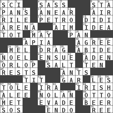 ACROSS 1. _-fi 4. Backtalk 8. R.R. building 11. Zero-star reviews 13. Approach 15. Atmosphere 16. Cause heat under the collar 17. Stone: prefix 18. "You Light Up My Life" star Conn 19. Sports stadium 21. Direct toward a target or goal 22. The content of cognition 23. Small child 24. Can I? 27. Baking dish 29. Capital of Western Samoa 30. Match 34. Cartoonist voice _ Blanc 36. To draw with force 39. Stay 40. Christmas carol 41. Take place subsequently 43. Arabian gulf 44. Lowest deck of a ship 46. Table seasoning 47. Nine, plus one 48. Musical pauses 49. Pismires 51. Teat (slang) 53. Slender fish 54. French article 57. Lacquered or enameled metalware 60. Lyricist Gershwin 63. From or relating to Ireland 65. Toward shelter 66. Pitcher Ryan 69. Von Bismarck 70. Was introduced to 71. Elude 72. Fermented drink made from hops 73. Mayday 74. Inside; within (prefix) 75. To riddle DOWN 1. Small fatty European fish 2. Capital of Egypt 3. An arm off of a larger body of water 4. Plant excrement 5. One (Scot) 6. Stalk of a moss capsule 7. Indian skirt 8. Stated 9. Event that recurs at intervals 10. Roberta Peters solo 12. Elected rep. 14. Play 18. Empty-headed or silly people 20. Electrical Unit 25. Helper 26. Entertaining tales 28. American Automobile Association (abbr.) 29. One to whom something is allotted 31. Travel on an animal 32. Genesis locale 33. Car or cant ending 34. Greater amount 35. Snakelike fish 37. White ___ sheet 38. Russian prison camp 40. And not 42. Inactive volcano in Sicily 45. 23rd letter of the Greek alphabet 50. Three (prefix) 52. Prong on a fork 54. 61 cubic inches 55. First name in cosmetics 56. Dinah or Pauly 57. Scottish caps 58. Butter sub 59. Allows 61. Be footloose 62. Actor Alda or Thicke 64. Director Reiner 67. Find the sum of 68. Modern: prefix