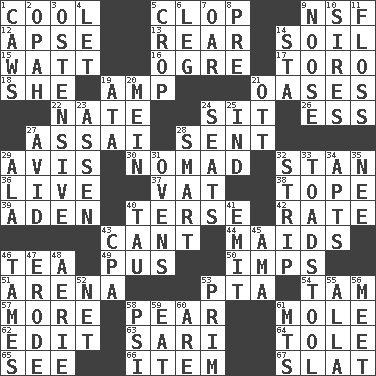 ACROSS 1. Calm and collected 5. Hoof sound 9. Science/research agcy. 12. Domed church section 13. Tail end 14. Earth 15. Electrical Unit 16. Legendary monster 17. "Corrida" creature 18. A female animal or person 19. Electrical Unit 21. Fertile tracts in a desert 22. Nathan's nickname 24. Be seated 26. Curvy letter 27. Slender Brazilian palm 28. Transmitted 29. Advice 30. Roamer 32. Comedian Laurel of Laurel & Hardy 36. Not recorded 37. Large container 38. Drink excessively 39. An important port of Yemen 40. Laconic 42. Assign a rank or rating to 43. Patter 44. Unmarried girls 46. Beverage made from leaves 49. Product of festering 50. Naughty children 51. Sports stadium 53. Parent Teacher Assoc. 54. Scottish cap 57. Greater amount 58. Lightbulb-shaped fruit 61. Undercover agent 62. Prepare for publication 63. Indian skirt 64. Lacquered or enameled metalware 65. Observe 66. A whole individual unit 67. Narrow board DOWN 1. Crow sounds 2. Brightly colored fish 3. Clearly or manifestly demonstrative 4. Allow 5. Riding implement 6. Part of a journey 7. Rowing implement 8. Before (prefix) 9. Trap for birds or small mammals 10. Begets 11. Soft thread for cleaning between teeth 14. R.R. building 19. "One Day ___ Time" 20. Chow _ 21. Baseball player Mel 23. NE Netherlands city 24. Theater features 25. Indiana (abbr.) 27. Enthusiastic 28. Don Adams' spy role 29. According to 31. Baking chambers 32. Empty completely 33. Inedible or poisonous agaric 34. Flats, for short 35. Born 40. The 19th letter of the Greek alphabet 41. Give off 43. Numbers guy (abbr.) 45. Housemaid (var.) 46. Makes less strong or intense 47. Eat (away) 48. Nest on high 52. Remaining after all deductions 53. Demure 55. Silent film actress Nazimova 56. Confront 58. Air pressure measure (abbr.) 59. Ingest 60. "We ___ not amused" (Victoria) 61. Mountains (abbr.)