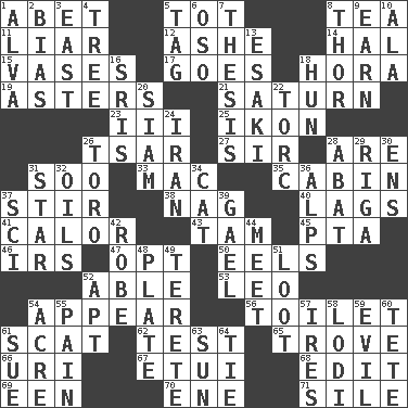 ACROSS 1. Collude with 5. Small child 8. Afternoon social gathering 11. One who doesn't tell the truth 12. American tennis player Robert 14. Actor Linden 15. Flower holders 17. Leaves 18. Israeli folk dance 19. Michaelmas daisies 21. Titan orbits this 23. One more than two 25. Image 26. Russian ruler of old 27. Title for a knight 28. "We ___ not amused" (Victoria) 31. "Barney Miller" actor Jack 33. Big _ 35. Apartment or room in a ship 37. Commotion 38. Tired old horse 40. Fails to keep up a pace 41. Bodily heat indicating an inflammation 43. Scottish cap 45. Parent Teacher Assoc. 46. Big collection agency 47. Elect 50. Snakelike fish 52. Competent 53. Lion 54. Become visible 56. Bathroom 61. Get outta here! 62. Trial 65. Collection of objects 66. RI univ. 67. Needle case 68. Prepare for publication 69. Car or cant ending 70. Compass dir. 71. Drop; flow; fall DOWN 1. Inventor's middle name 2. Prejudice 3. 90 degrees 4. Woody plant 5. Label 6. Bear (Spanish) 7. College paper 8. Son of Odin 9. Merit 10. According to 13. 1973 Nobel Price Winner (Physics) Leo 16. Indian titles of respect 18. Attila the _ 20. Thailand, formerly 22. Torque (variant) 24. SW Asia republic 26. "Corrida" creature 28. Blind as ____ 29. Capital of Latvia 30. Followers of ems 31. Play the lead 32. Petroleums 34. Domesticated feline 36. High mountains 37. _-fi 39. Highlander 42. Loose flowing garment 44. Rendezvous 48. Food holder 49. Cylindrical with tapered ends 51. Spoils 52. Fitting 54. 43,560 square feet 55. Ache 57. Angers 58. Farming town in central California 59. Morally bad or wrong 60. False hair 61. Take to court 63. Player for Phoenix 64. Neckwear