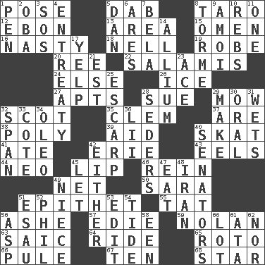 ACROSS 1. Airs 5. Apply (a substance) by light strokes 8. Pacific island yam 12. Inky black, to poets 13. Length times width 15. Sign of things to come 16. Characterized by obscenity 18. 1994 drama film starring Jodie Foster 19. Loose flowing garment 20. Portuguese money of account (variant) 22. Deli grouping 24. Otherwise 26. Frozen water 27. Tenement units (abbr.) 28. Take to court 29. Cut the grass 32. Native of Scotland 35. Clement's nick name 37. "We ___ not amused" (Victoria) 38. More than one (prefix) 39. Help 40. Three-handed card game 41. Had dinner 42. One of the Great Lakes 43. Snakelike fish 44. Modern: prefix 45. Mouth edge 46. It's straight from the horse's mouth 49. Remaining after all deductions 50. "Two Mules for Sister ____" 51. Curse 55. Make lace 56. American tennis player Robert 57. Singer Brickell 59. Pitcher Ryan 63. Ketch in the Levant 64. Travel on an animal 65. Printing process, for short 66. Whine 67. Nine, plus one 68. Play the lead DOWN 1. Animal enclosure 2. Chief or king in Benin or Nigeria 3. Distress signal 4. Plea 5. One of the 12 tribes of Israel 6. Ancient Greek god of war 7. Actor Lugosi 8. Singer Mel 9. Mine, in Marseilles 10. Confederate soldiers (slang) 11. Single 14. Plant genus of onion and garlic 17. Sharp bark 21. Eastern Standard Time (abbr.) 23. Adept person 25. Fortification 28. Spring feasts 29. Cause to be 30. Of the mouth 31. Soaks 32. Connect, as a bridge 33. ____ d'Azur (French Riviera) 34. Butter sub 36. Cards in a Roman deck? 40. Elected representatives 42. One or the other of two 45. Allow 47. Consume 48. SW Asia republic 49. Sibling's daughter 51. He sold his birthright 52. Silvers or Donahue 53. Prepare for publication 54. Event that recurs at intervals 56. Viper 58. Car or cant ending 60. Car dealer's back yard 61. "One Day ___ Time" 62. Not either
