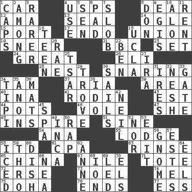 ACROSS 1. 4-wheeled motor vehicle 4. United States Postal Service (abbr.) 8. Letter starter 12. Nursemaid (var.) 13. Lick closed 14. Stare at amorously 15. Sweet dark-red dessert wine 17. Inside; within (prefix) 18. The state of being joined or united 19. Contemptuous expression 21. English channel? 23. Arrange properly for use 24. Relatively large 26. Connecticut Ivy Leaguer 28. A home for chicks 30. Catching in a trap 34. Scottish cap 37. Roberta Peters solo 39. Type of rug 40. _ tizzy (2 wds.) 41. "The Thinker" sculptor 43. Eastern Standard Time (abbr.) 44. Cooking vessels 46. Short-tailed, large-bodied rat 47. A female animal or person 48. Heighten or intensify 51. Trig term 54. Santa ___, CA 55. Cabin 58. It would 61. Accounting whiz (abbr.) 63. Wash lightly 65. Large country 67. The longest river in the world 71. Carryall 72. Celtic language 73. Christmas carol 74. Cartoonist voice _ Blanc 75. Capital of the state of Qatar 76. Extremities 77. Curvy letter DOWN 1. Smile enhancers 2. Amid 3. More valued for its uncommonness 4. Purpose 5. Elected rep. 6. Writing tablet 7. Oscar Madison type 8. Spanish title 9. Armor plate that protects the chest 10. _ vera 11. Monthly bill 16. Adolescent 18. Southern CA. univ. 20. Actress Charlotte 22. Benjamin's nick name 25. Russian ruler of old 27. Retirement account (abbr.) 29. Collection of objects 30. Travels by water 31. Angers 32. Soft 33. Yard entry 34. Native american tent (variation) 35. At once, immediately (arch.) 36. Floor coverings 38. Wedding promise 42. Famous astronaut Armstrong 45. Health resort 49. South American Indian 50. Reproach for some lapse or misdeed 52. And not 53. Prepare for publication 56. Dwarf 57. _____ Park, CO 58. On the rocks 59. Through, poetically 60. Food container 62. Singer Murray 64. Snakelike fish 66. Teachers' org. 68. Electrically charged atom 69. Directed 70. Raised railways