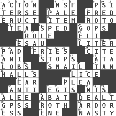 ACROSS 1. 13-14th century defensive garment 6. Science/research agcy. 9. Air pressure measure (abbr.) 12. Laconic 13. Light colored 14. Flintstone 15. Spew [out] 16. Detail 17. Printing process, for short 18. Afternoon social gathering 19. Moved rapidly 20. Republicans 21. Hero or heavy, e.g. 23. Connecticut Ivy Leaguer 24. He sold his birthright 25. 61 cubic inches 28. Groovy apt. 30. Strips of potato fried in deep fat 34. Quote 35. Black tropical American cuckoo 36. Closes up, plugs up 38. _ moment's notice (2 wds.) 39. Tennis shots 41. Slow-paced one 43. Scottish cap 44. Promenades 46. Louse (plural) 48. Hearing organ 49. Entreaty 50. Against 51. The front part of a cuirass 53. Mountains (abbr.) 56. Toward shelter 57. Blind as ____ 58. Started a card game 60. Global Positioning Systems (abbr.) 61. Writer of Portnoy's Complaint (1969) 62. Zeal 63. Curvy letter 64. Compass dir. 65. Smutty DOWN 1. Had dinner 2. Sure thing 3. Loyal 4. Motion picture awards 5. Fish or hair follower 6. Nathan's nickname 7. Downhill vehicle 8. Opposite of masc. 9. Conciliate 10. Puts into a specified state 11. Wedding promise 13. Corncob 14. Romp 19. Plays smoothly or legato 20. Set 22. Clumsy lout 24. The property of being fit to eat 26. Singer James 27. 480, 500 or 516 sheets of paper 28. Inside of hand 29. Small Philippine buffalo 31. It is 32. Period of immesurable duration 33. Health resort 37. Beverly of Met fame 40. Chalkboards 42. Whopper 45. _ Lanka 47. Device for capturing images 49. Heart or essence 50. High mountains 51. Inky black, to poets 52. Yard entry 54. Small amounts or degrees 55. Narrow, elongated depression 56. Grow older 57. "We ___ not amused" (Victoria) 58. Daniel's nick name 59. Attempt to accomplish something