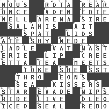 ACROSS 1. Good sense 5. Roll call or roster of names 9. Located in or toward the back 13. Single time 14. An important port of Yemen 15. Singer Brickell 16. Not ill 17. Sports stadium 18. Title for a man of rank and authority 19. Deli grouping 21. Small island 22. Argument over a trivial matter 23. Flaplike coverings 24. Had dinner 27. Like a shrinking violet 28. Ancient Persian 29. Dipping utensil 31. Large container 32. Political cartoonist Thomas 36. 4th largest of the Great Lakes 37. Mouth edge 38. Algonquian 39. Singer James 40. Beverage made from leaves 41. Confronts 42. Casino tip 44. A female animal or person 46. Fast jet (abbr.) 47. Through, poetically 48. Immeasurably long periods of time 50. Ocean 51. Smoochers 54. Play the lead 56. Dodge 58. Cuts off 60. Travel on or in a vehicle 61. Moving, as bait 62. Margarine 63. On the rocks 64. Lick closed 65. Make new DOWN 1. At this time 2. Washington bills 3. Southern CA. univ. 4. Exchanges for money 5. Noteworthy scarcity 6. Lyric poems 7. Nine, plus one 8. Santa ___, CA 9. Home 10. Proofreads 11. Atmosphere 12. To separate or throw off 17. Nanny 20. Domed church section 21. Help 23. Allow 24. Toward shelter 25. Small pie 26. Prepare for publication 28. Atlas unit 30. Resembling or made to resemble leather 31. By way of 33. Ancient Greek god of war 34. Arranges properly for use 35. Trial 37. Area sheltered from the wind 40. Ring climax 41. Not women's 43. Mouth or opening 44. A glass for beer 45. Stockings 47. Sadhe (variant) 49. Sir (Sp.) 51. Polynesian shrub of the pepper family 52. Cause heat under the collar 53. Broke a traffic law 54. _ Lanka 55. Nervous spasm 56. Raised railways 57. Compete 59. "Barney Miller" actor Jack