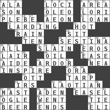 ACROSS 1. According to 4. Event scenes 8. Length times width 12. Male offspring 13. Margarine 14. Australian parrot (variant) 15. Cadet 18. A really long time 19. Rich soil 20. Preparing or cooking with lard 22. Being at a high temperature 23. Water falling in drops from the sky 24. Be seated 25. "___ Little Indians" 26. French poetic form 30. 100% 33. Killed 36. Greek god of love 37. Den 39. Petroleum 40. Relaxation 41. Helper 42. Zeal 44. Teachers' org. 45. Stimulate to action 47. Mouth or opening 50. Baseball player Mel 51. Canvas cover 53. Big collection agency 54. Of or relating to Laos or its people 57. Vertical spar for supporting sails 59. An important port of Yemen 61. Artist's stand 63. Stare 64. Left 65. Make a knot 66. Fermented drink made from hops 67. Extremities 68. Biblical high priest DOWN 1. Cleo's killer 2. Hang loosely or laxly 3. Approach 4. Grant temporary use of 5. Cassini of fashion 6. Corporate head (abbr.) 7. Electrically charged atom 8. One to whom something is allotted 9. Carrot, for example 10. Period 11. Direct toward a target or goal 16. Naughty child 17. Singer Brickell 21. Lodging establishments 22. Part of HMS, perhaps 24. Elected rep. 26. Grain storage tower 27. SW Asia republic 28. Olfactory organ 29. At sea 30. Jai _ 31. (Had) reclined 32. Hats (slang) 34. Old wives' tales, e.g. 35. Assist 38. News announcer 42. Tate display 43. Printing process, for short 46. ___ a Wonderful Life 48. Pace 49. Roberta Peters solo 52. Thick mixture 53. Small island 54. Grant temporary use of 55. Pismires 56. Famous astronaut Armstrong 57. Crowd into 58. Mature 59. Deep reverence 60. Lair 62. Flowery wreath