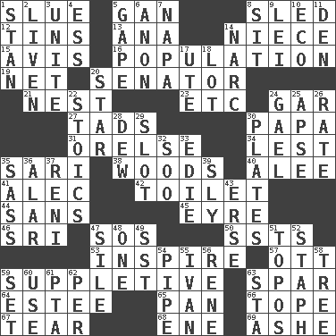 ACROSS 1. Change direction abruptly 5. Separate the seeds from cotton 8. Downhill vehicle 12. Airtight sealed metal containers 13. Santa ___, CA 14. Sibling's daughter 15. Advice 16. Census information 19. Fish or hair follower 20. Legislator 21. A home for chicks 23. And so on (abbr.) 24. Slender fish 27. Small boys 30. Dad 31. Threatening words 34. For fear that 35. Indian skirt 38. Forest 40. Toward shelter 41. Actor Baldwin 42. Bathroom plumbing fixture 44. Without 45. Jane of fiction 46. _ Lanka 47. Distress signal 50. Fast planes 53. Stimulate to action 57. Baseball player Mel 59. Supplying deficiencies 63. Coast Guard woman 64. First name in cosmetics 65. Baking dish 66. Drink excessively 67. Pull into pieces 68. Compass dir. 69. American tennis player Robert DOWN 1. Comedian Laurel of Laurel & Hardy 2. Make or become more lively 3. Join together 4. Curvy letter 5. Open wide 6. Soon (poet.) 7. California wine valley 8. Be seated 9. Luau accessory 10. Environmental prefix 11. Lair 14. Drug cop 17. Shoshoni 18. Car dealer's back yard 20. Play the lead 22. Unemotional ones 24. Highlander 25. Domed church section 26. Pace 28. Morning condensation 29. Narrow, elongated depression 30. Food holders 32. "Barney Miller" actor Jack 33. Singer Brickell 35. Backtalk 36. Having or resembling wings 37. Painter Guido (1575-1642) 39. Secret 43. Celtic language 47. Drop; flow; fall 48. Single 49. Fast jet (abbr.) 51. Literary convention 52. Staphylococcus 54. Corncob 55. _ the terrible 56. French philosopher Descartes 58. Relationship diagram 59. Put into a specified state 60. Purpose 61. Parent Teacher Association (abbr.) 62. For each 63. R.R. building