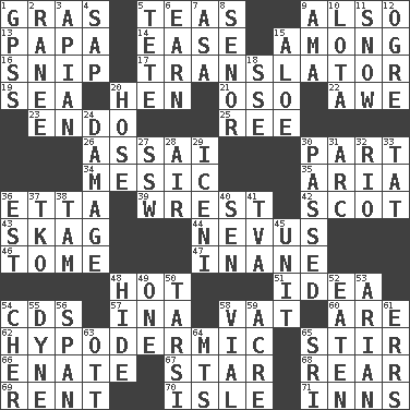 ACROSS 1. Pate de foie ____ 5. Afternoon social gatherings 9. In addition 13. Dad 14. Comfort 15. Amid 16. Sever or remove by pinching or nipping 17. Interpreter 19. Ocean 20. Layer 21. Bear (Spanish) 22. Deep reverence 23. Inside; within (prefix) 25. To sift 26. Slender Brazilian palm 30. Component 34. Mesonic 35. Roberta Peters solo 36. Singer James 39. Take or capture by force 42. Native of Scotland 43. Heroin 44. Congenital growth or mark on the skin 46. Heavy book 47. Empty; void 48. Being at a high temperature 51. It may be bright or harebrained 54. Music discs 57. _ tizzy (2 wds.) 58. Large container 60. "We ___ not amused" (Victoria) 62. Under the skin 65. Agitate 66. Related on the mother's side 67. Play the lead 68. Bring up, as a child 69. Monthly bill 70. Capri or Wight 71. Restaurants DOWN 1. Global Positioning Systems (abbr.) 2. Indian princess (variant) 3. Bee-related 4. Plant excrement 5. False hair 6. Merit 7. White ___ sheet 8. Sir (Sp.) 9. Wet nurse (var.) 10. Globular water bottle used in Asia 11. Overwhelm 12. Legendary monster 15. Medicinal plant 18. Compass dir. 20. Stockings 24. Break 27. Compass dir. 28. Atmosphere 29. Ancient Celtic tribe of eastern Britain 30. Went by 31. Curve 32. _ de Janeiro 33. Make lace 36. Eastern Standard Time (abbr.) 37. Ring climax 38. Scottish cap 40. Elected rep. 41. Federal power corp. 45. A single undivided whole 48. Flintstone garb 49. Single 50. Tarsus (plural) 52. Ingested 53. Believer in; advocate of (suffix) 54. "Mermaids" star 55. Centimeter-gram-second unit of force 56. Connect, as a bridge 58. Small bottle 59. Measure of real estate 61. Blunders 63. Baseball player Mel 64. Mountains (abbr.) 65. Indian title of respect (Mr.)