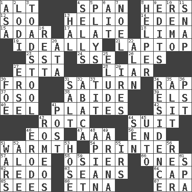 ACROSS 1. Keyboard modifier key 4. Connect, as a bridge 8. Possessive pronoun 12. "Barney Miller" actor Jack 13. Sun: prefix 14. Locale of original sin 15. The sixth month of the Jewish calendar 17. Having winglike extensions 18. Pale green bean 19. Under perfect conditions 21. Portable computer 23. Fast jet (abbr.) 24. Compass dir. 26. French article 27. Singer James 28. One who doesn't tell the truth 30. From 31. Titan orbits this 34. Hit sharply and swiftly 37. Bear (Spanish) 38. Tolerate 39. Raised railways 40. Snakelike fish 41. Food holders 42. Be seated 43. College mil. group 44. Set or collection 46. Greek goddess of the dawn 47. Auto club (abbr.) 50. Conclude 51. Heat 54. Hard copy producer 57. _ vera 58. Flexible twig of a willow tree 60. Singles 62. Redecorate 63. Seines 64. Head covering 65. Observes 66. Inactive volcano in Sicily 67. Epoch DOWN 1. White ___ sheet 2. Farming town in central California 3. Inedible or poisonous agaric 4. Exchanges for money 5. Live dramatic performances 6. Small island 7. Christmas carol 8. Assistant 9. Proofreads 10. San ____ (Riviera town) 11. Fastener 13. Actor Linden 16. Take ten 20. "One Day ___ Time" 22. Actor Alda or Thicke 25. Evade 27. Celtic language 29. Angers 30. Enemy 31. Table seasoning 32. Phillipine bananalike plant 33. Teat (slang) 34. Dwelling 35. Set down 36. Pacific Standard Time (abbr.) 41. Mail 43. Lover boys 44. Elected rep. 45. To (old English) 46. Eat (away) 48. Bee-related 49. Sports stadium 51. Armed conflicts 52. Toward shelter 53. Flexible conduit 55. Big collection agency 56. Posterior 59. Put into a specified state 61. Health resort