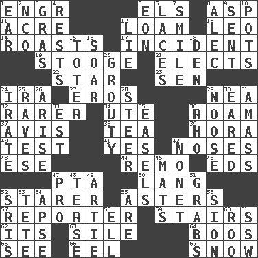 ACROSS 1. Engineer (abbr.) 5. Raised railways 8. Viper 11. 1/640 square mile 12. Rich soil 13. Lion 14. Exposes to great heat 17. Event 19. Moe Howard, for one 21. Chooses 22. Play the lead 23. Elected rep. 24. Retirement account (abbr.) 27. Greek god of love 29. Teachers' org. 32. More valued for its uncommonness 34. Shoshoni 36. Wander 37. Opinion 38. Afternoon social gathering 39. Israeli folk dance 40. Trial 41. Affirmative reply 42. Olfactory organs 43. Compass dir. 44. San ____ (Riviera town) 46. Begley and Asner 47. Parent Teacher Association (abbr.) 50. Long (Scottish) 52. A viewer who gazes fixedly 55. Michaelmas daisies 57. News announcer 59. Flight of steps 62. ___ a Wonderful Life 63. Drop; flow; fall 64. Scornful sounds 65. Perceive with the eye 66. Snakelike fish 67. Overwhelm DOWN 1. Ewer handle 2. Non-commissioned officer (abbr.) 3. Pate de foie ____ 4. Musical pauses 5. Period of immesurable duration 6. Shoestrings 7. Grin 8. Actor Baldwin 9. Emitted 10. Plant holders 12. Whopper 15. Carrier 16. Fly high 18. Lair 20. Sulky 24. Feeling or showing extreme anger 25. All-night dance parties 26. Ascend 28. Guide 29. Trap for birds or small mammals 30. Having ears or earlike features 31. Collect or gather 33. Eastern Standard Time (abbr.) 35. Artist's stands 36. 17th letter of the Greek alphabet 42. Music written for nine 45. Floor coverings 47. Adept person 48. Laconic 49. Nick name for Arthur 51. Takes hold of 52. Indian titles of respect 53. False hair 54. Domed church section 55. "We ___ not amused" (Victoria) 56. The Jewish people; Israel 58. Pipe bend 60. Friend of Pooh 61. Compass dir.