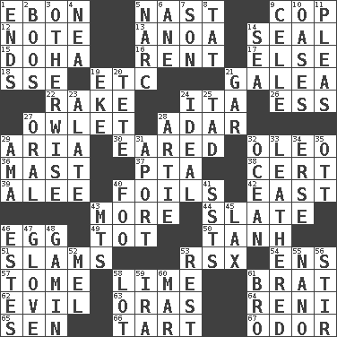ACROSS 1. Inky black, to poets 5. Political cartoonist Thomas 9. Police officer (slang) 12. Musical sound 13. Small Philippine buffalo 14. Lick closed 15. Capital of the state of Qatar 16. Monthly bill 17. Otherwise 18. Compass dir. 19. And so on (abbr.) 21. An organ shaped like a helmet 22. Libertine 24. Call ___ day 26. Double-curved letter 27. A small or young owl 28. The sixth month of the Jewish calendar 29. Operatic vocal solo 30. Having ears or earlike features 32. Butter sub 36. Vertical spar for supporting sails 37. Parent Teacher Assoc. 38. Certainty 39. Toward shelter 40. Fencing necessities 42. 90 degrees 43. Greater amount 44. Schedule 46. Oval reproductive body of a fowl 49. Small child 50. Hyperbolic tangent 51. Criticizes harshly 53. Acura sports coupe 54. Followers of ems 57. Heavy book 58. Citrus frut 61. Naughty child 62. Morally bad or wrong 63. Mouths or openings 64. Painter Guido (1575-1642) 65. Elected rep. 66. Small pie 67. Scent DOWN 1. Extremities 2. Scornful sounds 3. Else 4. Teachers' org. 5. Drug cop 6. A saturated hydrocarbon 7. Manchild 8. Make lace 9. Cell (Danish) 10. Fertile tracts in a desert 11. Entreaties 14. Ocean 19. Make supply last 20. False hair 21. Slender fish 23. Having winglike extensions 24. Standard of perfection 25. Bit 27. Of the mouth 28. Nick name for Arthur 29. Housemaid (var.) 31. To the left, to Queeg 32. Sea 33. Tough but pliablecoriaceous 34. Celtic language 35. Baseball player Mel 40. Egg _ yung 41. Fast planes 43. Mountains (abbr.) 45. Not strict 46. _____ Park, CO 47. Michael Jackson trademark 48. Street urchin 52. Cartoonist voice _ Blanc 53. Repose 55. Billionth: prefix 56. Commotion 58. Car dealer's back yard 59. Lyricist Gershwin 60. Impair 61. Sis' sibling