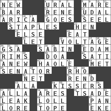 ACROSS 1. ___ Haven, CT 4. Mountain range 8. Female horse 12. Long, evenly shaped piece 13. French philosopher Descartes 14. Allodial 15. N. Chile seaport 18. Moves 19. Stitch closed the eyes of (a falcon) 20. Paper fasteners 22. Layer 23. Otherwise 24. Ingest 25. Allow 26. Electrical Measurement 30. Girls' org. (abbr.) 33. Unit of acoustic absorption 36. Dutch treat 37. Basketball hoops 39. ___ good deed 40. Suttee (variant) 41. Afresh 42. White Person, in Hawaii 44. Was introduced to 45. Elected representative 47. 17th letter of the Greek alphabet 50. Fish or hair follower 51. Tear apart 53. Insect wing 54. Smoochers 57. Silent film actress Nazimova 59. Ancient Greek god of war 61. Sadhe (variant) 63. Path through which fluid escapes 64. Hang loosely or laxly 65. Baking dish 66. Old wives' tales, e.g. 67. Drink excessively 68. Make supply last DOWN 1. Basketball assoc. 2. Hearing organs 3. Compose 4. Goad 5. Vintage cars 6. A saturated hydrocarbon 7. French article 8. French bagpipes 9. An important port of Yemen 10. Actress Charlotte 11. Pipe bend 16. Give a ring to 17. Domed church section 21. Allows 22. Actor Linden 24. Period of immesurable duration 26. Small bottle 27. First man 28. Yard entry 29. Give off 30. Pate de foie ____ 31. Trig term 32. So be it 34. The sixth month of the Jewish calendar 35. Oct. 31 cry 38. Tchaikovsky ballet 42. Being at a high temperature 43. Blunders 46. Afternoon social gathering 48. Behest 49. Washington bills 52. Window treatment 53. Having or resembling wings 54. Seaweed 55. Small island 56. Neighbor of Neb. 57. 100% 58. Lion 59. Keyboard modifier key 60. Friend of Pooh 62. Compass dir.