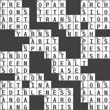 ACROSS 1. Before (prefix) 4. Brightly colored fish 8. Bowlike part 12. Immeasurably long periods of time 14. Wig 15. Grain storage tower 16. Collude with 17. Interpreter 20. San ____ (Riviera town) 21. Observe 22. Accounting whiz (abbr.) 23. Tall tales 27. Tender 29. "This won't hurt ____!" 31. Sliced desserts 34. Practice fights 35. Take ten 36. Southeast Asian peninsula 39. Erode 41. Toward the sea 42. Adolescent 43. Started a card game 46. Exchanged or delivered for money 47. Relaxation 48. Period of immesurable duration 51. Soup utensil 54. Dripping 56. _ tizzy (2 wds.) 58. Tennis shots 61. The property of being fit to eat 66. Actor Alda or Thicke 67. Small Philippine buffalo 68. Pacific island yam 69. Papal veil 70. Austrian-born American filmmaker Fritz 71. Indian titles of respect 72. ___ Haven, CT DOWN 1. Lightbulb-shaped fruit 2. Loose flowing garment 3. Foe 4. Baseball player Mel 5. For each 6. _ moment's notice (2 wds.) 7. Coop moms 8. White ___ sheet 9. Actors Guy, Robert Welles, and Clint 10. Hoof sound 11. Israeli folk dance 13. Portico 18. Elected rep. 19. Area sheltered from the wind 24. Strike 25. Basketball assoc. 26. Father 28. Small fatty European fish 30. Sadhe (variant) 32. Compass dir. 33. R.R. building 34. Message 36. ___ a Wonderful Life 37. Modern: prefix 38. Conveyance 40. Beverages made from leaves 44. Viper 45. Lion 49. Lubricate 50. Compass dir. 52. Norwegian king 53. Pitcher Ryan 54. Welt 55. Pulitzer Prize-winning author Ferber 57. Pismires 59. Object of repulsion 60. Frozen precipitation 62. Container for groceries 63. Hearing organ 64. _ Lanka 65. Mayday