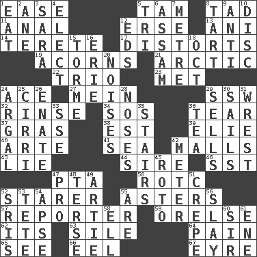 ACROSS 1. Relaxation 5. Scottish cap 8. Small amount or degree 11. Of or related to the anus 12. Celtic language 13. Black tropical American cuckoo 14. Cigar-shaped 17. What propaganda does 19. Oak nuts 21. Northern region 22. Musical group of three 23. Was introduced to 24. Adept person 27. Chow _ 29. Compass dir. 32. Wash lightly 34. Mayday 36. Pull into pieces 37. Pate de foie ____ 38. Eastern Standard Time (abbr.) 39. Writer Wiesel 40. Johnson of "Laugh-In" 41. Ocean 42. Shopping centers 43. Whopper 44. Father 46. Fast jet (abbr.) 47. Parent Teacher Association (abbr.) 50. College mil. group 52. A viewer who gazes fixedly 55. Michaelmas daisies 57. News announcer 59. Threatening words 62. ___ a Wonderful Life 63. Drop; flow; fall 64. Ache 65. Observe 66. Snakelike fish 67. Jane of fiction DOWN 1. Ingest 2. A saturated hydrocarbon 3. "Two Mules for Sister ____" 4. Opt 5. Three (prefix) 6. Indian state 7. Distance measurement (Brit.) 8. Small pie 9. Against 10. Plate 12. Begley and Asner 15. Singer Mel 16. 4th largest of the Great Lakes 18. Sep. follower 20. Annoying sounds 24. Therefore, facetiously 25. High-altitude cloud 26. Related on the mother's side 28. Olfactory organs 29. Exchanges for money 30. Travels by water 31. Obtain by seizing forcibly or violently 33. Compass dir. 35. Flight of steps 36. Afternoon social gathering 42. Distance measurement 45. Printing process, for short 47. Adept person 48. Laconic 49. Nick name for Arthur 51. Streamer paper 52. Indian titles of respect 53. False hair 54. Domed church section 55. "We ___ not amused" (Victoria) 56. Kill 58. Pipe bend 60. Title for a knight 61. Compass dir.