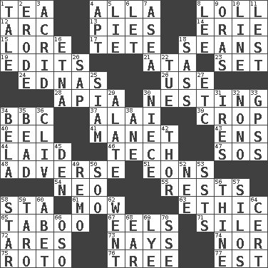ACROSS 1. Beverage made from leaves 4. Silent film actress Nazimova 8. Hang loosely or laxly 12. Curve 13. Sliced desserts 14. One of the Great Lakes 15. Old wives' tales, e.g. 17. Wig 18. Actors Connery and Penn 19. Prepares for publication 21. "One Day ___ Time" 23. Put into a specified state 24. Ferber et al. 26. Purpose 28. Capital of Western Samoa 30. Inhabiting a nest 34. English channel? 37. Mountain range southwest of Kyrgyzstan 39. Riding implement 40. Snakelike fish 41. French painter Edouard 43. Followers of ems 44. Put down 46. Technician 47. Mayday 48. Contrary to your interests or welfare 51. Immeasurably long periods of time 54. Modern: prefix 55. Musical pauses 58. R.R. building 61. Cut the grass 63. Moral principle 65. Off limits 67. Snakelike fish 71. Drop; flow; fall 72. Ancient Greek god of war 73. Negative votes 74. And not 75. Printing process, for short 76. Relationship diagram 77. Eastern Standard Time (abbr.) DOWN 1. Story 2. Eat (away) 3. Bitter 4. Fitting 5. Falsehood 6. Allow 7. At sea 8. Area sheltered from the wind 9. Mouths or openings 10. Actor's bit 11. For fear that 16. Inactive volcano in Sicily 18. Backtalk 20. Plant excrement 22. Third day of the wk. 25. Thailand, formerly 27. And so on (abbr.) 29. Having winglike extensions 30. Sibling's daughter 31. Angers 32. Words to Nanette 33. Global Positioning Systems (abbr.) 34. Actor Lugosi 35. Necklace unit 36. 154 in Roman numerals 38. A saturated hydrocarbon 42. Son of Odin 45. Lair 49. San ____ (Riviera town) 50. "Barney Miller" actor Jack 52. Born 53. Fast planes 56. One or ones belonging to thee 57. Grain storage towers 58. Play the lead 59. Edible starchy tuberous root 60. Collude with 62. Gone 64. An absolute certainty 66. Bear (Spanish) 68. Hearing organ 69. Sodium hydroxide 70. Compass dir.