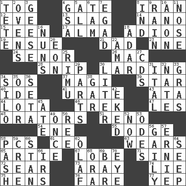 ACROSS 1. Coat; cloak 4. Yard entry 8. SW Asia republic 12. First lady 13. Volcanic refuse 14. Billionth: prefix 15. Adolescent 17. _ mater 18. Goodbye (Sp.) 19. Take place subsequently 21. June honoree 23. Compass dir. 24. Sir (Sp.) 26. Big _ 28. Sever or remove by pinching or nipping 30. Preparing or cooking with lard 34. Distress signal 37. Wise men 39. Play the lead 40. Binary compound 41. A salt of uric acid 43. _ moment's notice (2 wds.) 44. Globular water bottle used in Asia 46. Long journey 47. French article 48. Speakers 51. Western Nevada city 54. Compass dir. 55. Evade 58. Personal Computers (abbr.) 61. Corporate head (abbr.) 63. Erodes 65. Nick name for Arthur 67. Ear part 71. Trig term 72. Scorch 73. Like ___ of sunshine 74. Falsehood 75. Coop moms 76. Conductor's collection 77. Slangy assent DOWN 1. Wig 2. Baking chambers 3. Honkers 4. Girls' org. (abbr.) 5. Everything 6. Scottish cap 7. Mild oath 8. Indiana (abbr.) 9. Water falling in drops from the sky 10. Soon (poet.) 11. Olfactory organ 16. Religious women 18. The sixth month of the Jewish calendar 20. A really long time 22. Wet nurse (var.) 25. Tall New Zealand timber tree 27. Music discs 29. Pieces 30. 61 cubic inches 31. Slanted text style (abbr.) 32. Nathan's nickname 33. Pate de foie ____ 34. Grain storage tower 35. Aroma 36. Stalk of a moss capsule 38. Slender fish 42. Supplemented with great effort 45. Had dinner 49. At one time in the past 50. Portuguese money of account (variant) 52. At this time 53. Lyric poems 56. Lightheartedly 57. Bert's buddy 58. Romantic infatuation 59. Algonquian 60. Comedian Laurel of Laurel & Hardy 62. Norwegian king 64. Ooze 66. Big collection agency 68. Mouth or opening 69. Tavern 70. Sight organ