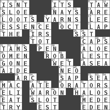 ACROSS 1. Is not 5. It is 8. The 23rd letter of the Hebrew alphabet 11. A type of plum 12. Negative votes 14. "We ___ not amused" (Victoria) 15. Plunders 17. Entertaining tales 18. Area sheltered from the wind 19. Substance 21. Sep. follower 22. Infant locale 23. Definite Article 24. Big collection agency 25. Fast jet (abbr.) 27. Small child 28. Balmoral and tarboosh 31. Scottish caps 35. Fenced enclosure 37. Medicinal plant 38. Sign of something about to happen 39. Director Reiner 41. For fear that 42. Went 43. Dripping 45. Toward the sea 46. Helper 47. Modern: prefix 49. Curve 51. Plant excrement 52. Ocean 55. Apple computer (short form) 57. Had dinner 60. Speakers 62. Biblical high priest 63. Make _____ (do battle with) 65. Auras 66. Erode 67. Narrow opening 68. Ancient Persian 69. Attempt 70. Eastern Standard Time (abbr.) 71. Paradise DOWN 1. Small island 2. Make a splashing sound 3. Trap for birds or small mammals 4. False hair 5. _ tizzy (2 wds.) 6. Edible starchy tuberous root 7. Synchronize (abbr.) 8. Baron Munchausen's specialties 9. Length times width 10. Shed a tear 13. Fast planes 16. In a ____ (agitated or irritated) 17. Of or pertaining to yesterday 20. Riding implement 26. Any of the three canals of the cochlea 29. Introduce or present, as a question 30. Bristle 31. Ancient Roman robe 32. Mine, in Marseilles 33. Ananias' fault 34. Contemptuous expression 36. At this time 40. Gillaume's butler role 44. Pull into pieces 48. Brightly colored fish 50. Crow sounds 52. Having a sole or soles 53. Wear away 54. NE Netherlands city 55. Confront 56. Having or resembling wings 58. Story 59. Greek god of love 61. Not wild 64. Baseball player Mel