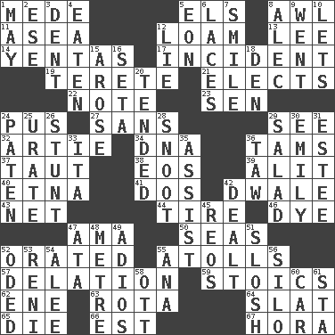 ACROSS 1. Ancient Persian 5. Raised railways 8. Leather borer 11. Toward the sea 12. Rich soil 13. Area sheltered from the wind 14. Gossips 17. Happening 19. Cylindrical with tapered ends 21. Chooses 22. Brief written record 23. Elected rep. 24. Fluid product of inflammation 27. Without 29. Observe 32. Nick name for Arthur 34. Heredity factor (abbr.) 36. Scottish caps 37. Pulled tight 38. Greek goddess of the dawn 39. Came down and settled, as after flight 40. Inactive volcano in Sicily 41. Two (Sp.) 42. A sleeping potion; an opiate (poet.) 43. Fish or hair follower 44. Become fatigued 46. Color 47. Housemaid (var.) 50. Oceans 52. Declaimed 55. Ringlike coral islands and reefs 57. Accusation by an informer 59. Unemotional ones 62. Compass dir. 63. Round or rotation of duties 64. Narrow board 65. Expire 66. Eastern Standard Time (abbr.) 67. Israeli folk dance DOWN 1. Can I? 2. Compass dir. 3. Undesirable depression on a surface 4. Ingested 5. Period of immesurable duration 6. Shoestrings 7. Grin 8. Actor Baldwin 9. Left 10. Allows 12. Whopper 15. Came up 16. Bristle 18. Lair 20. Watched over 24. Eucharist need 25. A salt of uric acid 26. Difficult or unusual or dangerous feat 28. Snout, nose 29. Vegetable dish 30. Poet Dickinson 31. First name in cosmetics 33. Call ___ day 35. Aid 36. The 23rd letter of the Hebrew alphabet 42. Started a card game 45. Vintage cars 47. "One Day ___ Time" 48. Distance measurement (Brit.) 49. Goodbye (Sp.) 51. Agitate, as a liquid 52. Wrote a lyric poem 53. Painter Guido (1575-1642) 54. Toward shelter 55. Santa ___, CA 56. Grain storage tower 58. Baseball player Mel 60. 4-wheeled motor vehicle 61. R.R. building