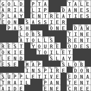ACROSS 1. Gilded 5. Parent Teacher Association (abbr.) 8. Falsehood 12. Operatic vocal solo 13. Mouth edge 14. Natives or inhabitants of Denmark 15. Shaw product 16. Pleas 19. A really long time 20. More lively and spirited 21. Romantic infatuation 23. Single 24. Simpleton 27. Tennis shots 30. Prong on a fork 31. Ringlike coral islands and reefs 34. Monthly bill 35. Repose 38. You are 40. Lyric poems 41. Migrant worker of the '30s 42. Bathroom 44. Grant temporary use of 45. Kill 46. Compass dir. 47. Atlas unit 50. Messy guy 53. Stimulate to action 57. Spanish title 59. Supplementary 63. Pulitzer Prize-winning author Ferber 64. Drop behind 65. Baking dish 66. Portable shelter 67. Helper 68. Compass dir. 69. Algonquian DOWN 1. Yawn 2. Lowest deck of a ship 3. Climbing, woody, usually tropical vines 4. 24 hours 5. Entreaty 6. Metal containers 7. Tenement units (abbr.) 8. Make lace 9. Black tropical American cuckoo 10. Area sheltered from the wind 11. Double-curved letter 14. Have the gumption 17. _ de Janeiro 18. Car or cant ending 20. Opportunity 22. Scheduled 24. Passed on 25. Singer Murray 26. Soaks 28. Male child 29. Groove 30. Trinitrotoluene 32. Nilotic language 33. Indian titles of respect 35. Hero or heavy, e.g. 36. Makes supply last 37. Trig term 39. Pipe bend 43. Relaxation 47. Place where flour is made 48. A saturated hydrocarbon 49. Pacific Standard Time (abbr.) 51. More peculiar 52. Maid-servant 54. Corncob 55. "Terrible" tsar 56. French philosopher Descartes 58. Nathan's nickname 59. R.R. building 60. RI univ. 61. Groovy apt. 62. Sliced dessert 63. And so on (abbr.)