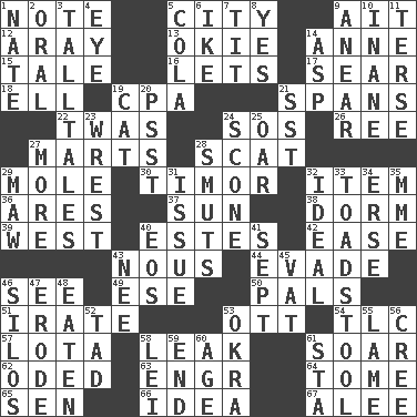 ACROSS 1. Musical sound 5. Municipality 9. Small island 12. Like ___ of sunshine 13. Migrant worker of the '30s 14. Queen of England 1702-14 15. Story 16. Allows 17. Dry up 18. Pipe bend 19. Accounting whiz (abbr.) 21. Connects, as a bridge 22. It was, poetically 24. Distress signal 26. To riddle 27. Shops 28. Leave at once 29. Undercover agent 30. The easternmost of the Lesser Sundas 32. A distinct part 36. Ancient Greek god of war 37. Player for Phoenix 38. Dormintory (informal) 39. Compass direction 40. _____ Park, CO 42. Comfort 43. Good sense 44. Elude 46. Observe 49. Compass dir. 50. Friends 51. Feeling or showing extreme anger 53. Baseball player Mel 54. Affectionate concern, for short 57. Globular water bottle used in Asia 58. Path through which fluid escapes 61. Fly high 62. Wrote a lyric poem 63. Engineer (abbr.) 64. Heavy book 65. Elected rep. 66. The main thing one is thinking about 67. Toward shelter DOWN 1. Nathan's nickname 2. Spoken 3. Baron Munchausen's specialties 4. Sight organ 5. Root beer relative 6. Eisenhower's nickname 7. Teat (slang) 8. Consenting reply 9. Approach 10. Lacking in sense or substance 11. Laconic 14. Cleo's killer 19. Domesticated feline 20. Inconspicuous attention getter 21. Fast jet (abbr.) 23. Obtain by seizing forcibly or violently 24. Biscuitlike quick bread 25. Boat paddle 27. Greater amount 28. Obscenities 29. Informal term for the mouth 31. Come out of 32. Standard of perfection 33. Inedible or poisonous agaric 34. Celtic language 35. Madame (abbr.) 40. Greek goddess of the dawn 41. Back-to-school mo. 43. Born 45. Large container 46. Grain storage towers 47. Wear away 48. Ingested 52. Bit 53. Gumbo ingredient 55. Unable to walk 56. Algonquian 58. Flowery wreath 59. Conclude 60. Ripen 61. R.R. building