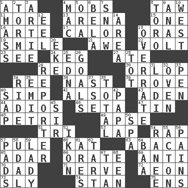 ACROSS 1. _ moment's notice (2 wds.) 4. Disorderly crowds 8. The 23rd letter of the Hebrew alphabet 11. Greater amount 13. Sports stadium 15. Single 16. Johnson of "Laugh-In" 17. Bodily heat indicating an inflammation 18. Mouths or openings 19. Grin 21. Deep reverence 22. Electrical Unit 23. Observe 24. Barrel 27. Had dinner 29. Redecorate 30. Lowest deck of a ship 34. To sift 36. Political cartoonist Thomas 39. Collection of objects 40. Simple or foolish person 41. Columnist Joseph or Stewart 43. Arabian gulf 44. Goodbye (Sp.) 46. Stalk of a moss capsule 47. Shallow baking pan 48. _ dish (used to culture cells) 49. Domed church section 51. Three (prefix) 53. Infant locale 54. Strike 57. Whine 60. Krazy ___ of comics 63. Phillipine bananalike plant 65. The sixth month of the Jewish calendar 66. Declaim 69. Against 70. June honoree 71. Impudent aggressiveness 72. Period of immesurable duration 73. Wily 74. Comedian Laurel of Laurel & Hardy 75. Followers of ems DOWN 1. Collect or gather 2. Singer Mel 3. Nick name for Arthur 4. Apple computer (short form) 5. Mouth or opening 6. Actor Lugosi 7. Overwhelm 8. "Corrida" creature 9. Of or related to the anus 10. 270 degrees 12. Snakelike fish 14. Length times width 18. Make much ado about nothing 20. Make supply last 25. Pulitzer Prize-winning author Ferber 26. Scores awarded for successful feats 28. Small child 29. Newsperson 31. Farming town in central California 32. Baking chamber 33. Writing instrument 34. Travel on an animal 35. Send forth 37. Compass dir. 38. Add up to 40. Plant excrement 42. Dad 45. Title for a knight 50. Health resort 52. Visual representation of an object 54. Indian princess (variant) 55. 13-14th century defensive garment 56. Aches 57. Groovy apts. 58. Freehold land 59. Kenny Rogers chart-topper in '80 61. Ancient Greek god of war 62. Small pie 64. Sound made by sheep 67. Federal power corp. 68. Car or cant ending