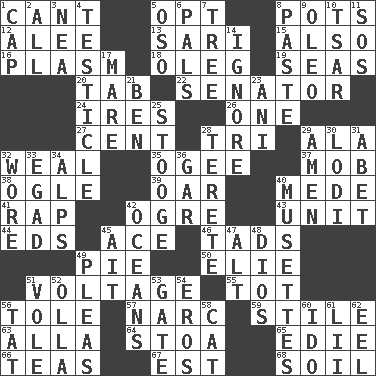 ACROSS 1. Patter 5. Choose 8. Plant holders 12. Toward shelter 13. Indian skirt 15. In addition 16. Suffix with ecto or cyto 18. Cassini of fashion 19. Oceans 20. Keyboard key 22. Elected representative 24. Angers 26. Single 27. Penny 28. Three (prefix) 29. According to 32. Welt 35. Double curve, resembling the letter S 37. Disorderly crowd 38. Stare 39. Boat paddle 40. Ancient Persian 41. Reproach for some lapse or misdeed 42. Legendary monster 43. A single undivided whole 44. Begley and Asner 45. Adept person 46. Small amounts or degrees 49. Sliced dessert 50. Writer Wiesel 51. Electrical Measurement 55. Small child 56. Lacquered or enameled metalware 57. Drug cop 59. Vertical member of a panel or frame 63. Silent film actress Nazimova 64. Portico 65. Singer Brickell 66. Beverages made from leaves 67. Eastern Standard Time (abbr.) 68. The visible part of the earth's surface DOWN 1. Head covering 2. Everything 3. Teachers' org. 4. One of the two male reproductive glands 5. Bear (Spanish) 6. Friends 7. Woody plant 8. Thick mixture 9. Margarine 10. Russian ruler of old 11. Distress signal 14. Refuse to acknowledge 17. Female horse 21. Benjamin's nick name 23. Cuckoo 25. Moe Howard, for one 28. Cigar-shaped 29. So be it 30. Farming town in central California 31. Collude with 32. Had on 33. Mild oath 34. High mountains 36. Slender fish 40. French bagpipes 42. Seas 45. Small island 47. Keyboard modifier key 48. "Vaya con ____" 49. Entreaties 51. Grand slam 52. Water jar 53. Yard entry 54. Greek god of love 56. Make lace 58. Domesticated feline 60. Wedding promise 61. Cards in a Roman deck? 62. Snakelike fish