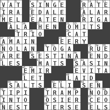 ACROSS 1. Large container 4. Scorch 9. Pace 13. Retirement account (abbr.) 14. Peak District village in England 15. Having or resembling wings 16. Cartoonist voice _ Blanc 17. Consumed 18. Port city in Latvia 19. In the manner of 21. Layer 22. Leaves out 24. Musical group of three 26. Domesticated feline 27. At full speed 29. Suggestive of the supernatural 30. Pitcher Ryan 31. Ancient Roman robe 33. Regret 36. "We ___ not amused" (Victoria) 37. French poetic form 40. Conclusion 41. French article 42. Floor coverings 43. Indian antelope 45. Arab leader 47. Webber/Rice musical 48. Allow 49. Put down 50. Table seasonings 52. Biblical high priest 54. Elected rep. 56. Native american tent (variation) 57. _____ steamer (cargo ship) 59. Dreamland 61. To the inside or interior of 62. Flexible twig of a willow tree 63. Corporate head (abbr.) 64. Egg locale 65. Laconic 66. Raised railways DOWN 1. Zeal 2. Length times width 3. Baron Munchausen's specialties 4. Perceive with the eye 5. Potato state 6. Nathan's nickname 7. Small, secluded valley 8. Car or cant ending 9. Noteworthy scarcity 10. Came down and settled, as after flight 11. Labels 12. Epoch 20. Roberta Peters solo 22. Sea 23. Spoil 25. Taverns 27. Of or related to the anus 28. Greater amount 29. Armor plate that protects the chest 31. Russian ruler of old 32. Baseball player Mel 33. Home 34. A single undivided whole 35. Pulitzer Prize-winning author Ferber 38. Gives off 39. At sea 44. Opinion 45. American author Paul (1891-1958) 46. Was introduced to 49. Citrus fruits 50. Trig term 51. Flats, for short 52. Celtic language 53. Den 55. Christmas carol 56. Shallow baking pan 57. Small child 58. Before (prefix) 60. Two (Sp.)