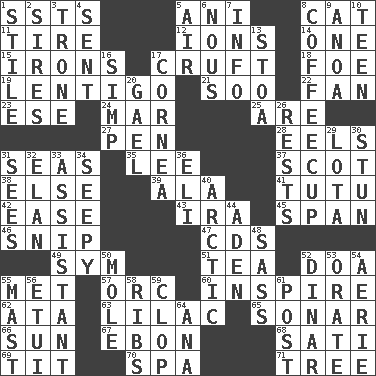 ACROSS 1. Fast planes 5. Cuckoo 8. Feline 11. Become fatigued 12. Charged particles 14. Single 15. Metal shackles 17. An unpleasant substance 18. Enemy 19. Small, flat, pigmented spot on the skin 21. "Barney Miller" actor Jack 22. Air blower 23. Compass dir. 24. Make imperfect 25. "We ___ not amused" (Victoria) 27. Writing instrument 28. Snakelike fish 31. Oceans 35. Area sheltered from the wind 37. Native of Scotland 38. Otherwise 39. According to 41. Ballerina skirt 42. Comfort 43. Lyricist Gershwin 45. Connect, as a bridge 46. Clip 47. Music discs 49. Symbol (abbr.) 51. Beverage made from leaves 52. ___ good deed 55. Was introduced to 57. The grampus (Milton) 60. Heighten or intensify 62. _ moment's notice (2 wds.) 63. Pale purple color 65. Echolocation 66. Player for Phoenix 67. Inky black, to poets 68. Suttee (variant) 69. Teat (slang) 70. Health resort 71. Woody plant DOWN 1. Vertical member of a panel or frame 2. Titles for men of rank and authority 3. Marketplace scale 4. Emitted 5. Atmosphere 6. Horse sense 7. A message received and understood 8. Java holder (2 wds.) 9. Small Philippine buffalo 10. Adolescent 13. Portico 16. Simple or foolish person 17. Pupil covering 20. Highlander 26. Musical pauses 29. Globular water bottle used in Asia 30. Make senseless or dizzy 31. Observes 32. Enthusiasm 33. Aide 34. Oozy 36. Biblical high priest 40. Northern region 44. Arabian gulf 48. Backtalk 50. Undercover agent 52. Middle Eastern gold or silver currency 53. Declaim 54. Nest on high 55. Vertical spar for supporting sails 56. Needle holder 58. Teases 59. Hoof sound 61. Mail 64. Santa ___, CA