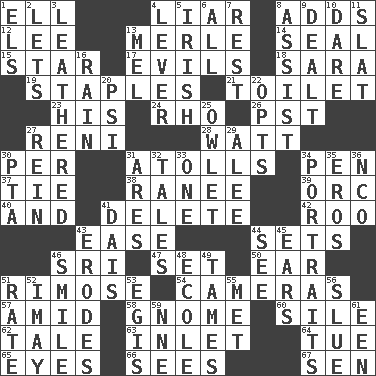 ACROSS 1. Pipe bend 4. One who doesn't tell the truth 8. Does sums 12. Area sheltered from the wind 13. Haggard of country music 14. Lick closed 15. Play the lead 17. Vices 18. "Two Mules for Sister ____" 19. Paper fasteners 21. Bathroom 23. Part of HMS, perhaps 24. 17th letter of the Greek alphabet 26. Pacific Standard Time (abbr.) 27. Painter Guido (1575-1642) 28. Electrical Unit 30. For each 31. Ringlike coral islands and reefs 34. Animal enclosure 37. Make a knot 38. Indian princess (variant) 39. The grampus (Milton) 40. Plus 41. Erase 42. Friend of Pooh 43. Relaxation 44. Puts into a specified state 46. _ Lanka 47. Arrange properly for use 50. Ewer handle 51. Full of chinks, cracks, or crevices 54. Devices for capturing images 57. Among 58. Dwarf 60. Drop; flow; fall 62. Story 63. An arm off of a larger body of water 64. Third day of the wk. 65. Sight organs 66. Observes 67. Elected rep. DOWN 1. Raised railways 2. Allows 3. Tough but pliablecoriaceous 4. Prying instrument 5. From or relating to Ireland 6. 100% 7. Remainder 8. Aid 9. Started a card game 10. Have the gumption 11. Narrow board 13. Cartoonist voice _ Blanc 16. Water falling in drops from the sky 20. 23rd letter of the Greek alphabet 22. Elects 25. A small or young owl 27. It's straight from the horse's mouth 29. Toward shelter 30. Parent Teacher Association (abbr.) 31. Ancient Greek god of war 32. Stories 33. Single 34. Likenesses of persons 35. Greek god of love 36. Non-commissioned officer (abbr.) 41. Raised platform 43. Eats (away) 44. Observe 45. Hearing organs 46. Grin 48. Learning spot: Fr. 49. Domesticates 51. Pace 52. "If ____ say so..." 53. Armor plate that protects the chest 55. Was introduced to 56. Change direction abruptly 59. Compass dir. 61. Car or cant ending
