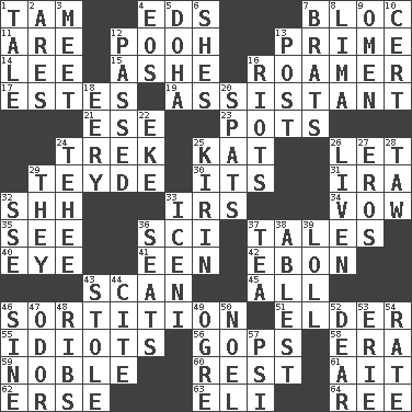 ACROSS 1. Scottish cap 4. Begley and Asner 7. Alliance 11. "We ___ not amused" (Victoria) 12. "Silly old bear" 13. First class 14. Area sheltered from the wind 15. American tennis player Robert 16. Wanderer 17. _____ Park, CO 19. Helper 21. Compass dir. 23. Cooking vessels 24. Long journey 25. Krazy ___ of comics 26. Allow 29. Miss Universe 1986, Barbara Palacios _ 30. It is 31. Lyricist Gershwin 32. Quiet! 33. Big collection agency 34. Solemn pledge 35. Perceive with the eye 36. _-fi 37. Stories 40. Sight organ 41. Car or cant ending 42. Inky black, to poets 43. Glance over 45. 100% 46. Decision 51. A person who is older than you are 55. Foolish or stupid persons 56. Republicans 58. Epoch 59. Having high moral qualities 60. State of inaction 61. Small island 62. Celtic language 63. Biblical high priest 64. Portuguese money of account (variant) DOWN 1. Lie 2. Ancient Greek god of war 3. Rendezvous 4. Greek goddess of the dawn 5. Capital of the state of Qatar 6. "______ My Girl" (Turtles hit) 7. Naughty children 8. Pale green bean 9. Presage 10. Certainty 12. Went by 13. Mail 16. Debaucheries 18. Suggestive of the supernatural 20. Arguments over trivial matters 22. Make supply last 24. Giggle 25. Japanese brewing company 26. Make or become more lively 27. Greek god of love 28. The 23rd letter of the Hebrew alphabet 29. Those things 32. Compass dir. 33. Ancient Celtic tribe of eastern Britain 36. Theater features 37. Afternoon social gathering 38. Most capable 39. Hang loosely or laxly 43. Fur scarf 44. Quote 46. Trig term 47. Scent 48. Teases 49. Legendary monster 50. Christmas carol 52. Letter starter 53. One of the Great Lakes 54. Pace 57. 23rd letter of the Greek alphabet