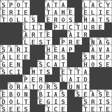 ACROSS 1. Specific locale 5. "One Day ___ Time" 8. Made of lace 12. 4th largest of the Great Lakes 13. Docile 15. Writer Wiesel 16. For Whom the Bell _____ 18. Greek god of love 19. Floor coverings 20. Cards in a Roman deck? 22. Photo 24. Johnson of "Laugh-In" 26. Atmosphere 27. For fear that 28. Before (prefix) 29. Tired old horse 32. Indian skirt 35. Pile 37. Actress Gardner 38. Toward shelter 39. Big collection agency 40. Clip 41. Commissioned military rank (abbr.) 42. Go away! 43. Flexible conduit 44. _-fi 45. Mountains (abbr.) 46. Singer James 49. For each 50. Put down 51. Speakers 55. Corn or form start 56. Inky black, to poets 57. Prejudice 59. Gospel singer Marvin 63. Dunce 64. Armor plate that protects the chest 65. Indian titles of respect 66. Perceives with the eye 67. Frozen water 68. Wig DOWN 1. Arrange properly for use 2. Adept person 3. Lubricate 4. Copy Pinocchio 5. Had dinner 6. Canvas cover 7. Mine, in Marseilles 8. Arboreal primate 9. Having or resembling wings 10. Quote 11. Affirmative reply 14. Fortification 17. Father 21. It is 23. Make a knot 25. Moral principles 28. Soft color 29. Billionth: prefix 30. Opinion 31. Stare wonderingly 32. Settles 33. Actor Baldwin 34. Painter Guido (1575-1642) 36. Period 40. Most dark, concealed or hidden 42. Disco prop 45. Was introduced to 47. The 19th letter of the Greek alphabet 48. Metal containers 49. Leg coverings 51. Mitch Miller's instrument 52. Hero or heavy, e.g. 53. Swiss mountan, "Queen of the Mountains" 54. Ketch in the Levant 56. Begley and Asner 58. Compass dir. 60. "We ___ not amused" (Victoria) 61. Be seated 62. Compass dir.