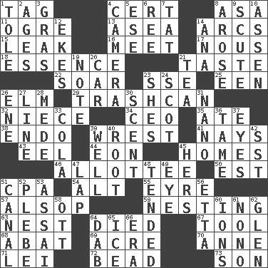 ACROSS 1. Label 4. Foregone conclusion 8. White ___ sheet 11. Legendary monster 13. At sea 14. Curves 15. Path through which fluid escapes 16. Rendezvous 17. Common sense 18. Core 21. Clothes sense 22. Fly high 23. Compass dir. 25. Car or cant ending 26. Shade tree 29. File 13 32. Sibling's daughter 34. Corporate head (abbr.) 35. Had dinner 38. Inside; within (prefix) 39. Obtain by seizing forcibly or violently 41. Negative votes 43. Snakelike fish 44. Period of immesurable duration 45. Residences 46. One to whom something is allotted 50. Eastern Standard Time (abbr.) 51. Tax preparer (abbr.) 54. The first octave above the treble staff 55. Jane of fiction 57. Columnist Joseph or Stewart 59. Nestling 63. A home for chicks 64. Passed on 67. Instrument 68. Blind as ____ 69. 1/640 square mile 70. Queen of England 1702-14 71. Luau accessory 72. Necklace unit 73. Male offspring DOWN 1. Lacquered or enameled metalware 2. Ripens 3. Pate de foie ____ 4. Device for capturing images 5. Compass dir. 6. Portuguese money of account (variant) 7. Make lace 8. Came up 9. Snake scale 10. NE Netherlands city 12. Makes supply last 14. Santa ___, CA 19. Make mention of 20. 4-wheeled motor vehicle 21. Beverage made from leaves 23. "______ My Girl" (Turtles hit) 24. Native of Scotland 26. Compass dir. 27. Actor's bit 28. Ancient Persian 30. Odor 31. Billionth: prefix 33. Root beer relative 36. Not wild 37. Sight organs 39. Water source 40. Carrot, for example 42. Fast jet (abbr.) 45. Possessive pronoun 47. Infant locale 48. Watched over 49. Sight organ 51. Lessep's creation 52. First-year military academy student 53. Slender Brazilian palm 56. Singer James 58. Baseball player Mel 60. Charged particles 61. Words to Nanette 62. Small, secluded valley 64. Pat or tap gently 65. Frozen water 66. Epoch