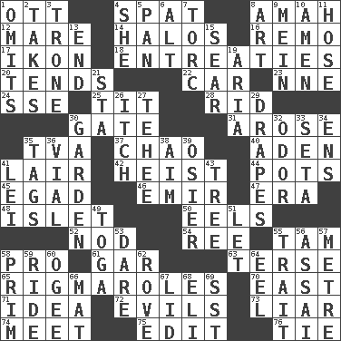 ACROSS 1. Baseball player Mel 4. Petty quarrel 8. Nanny 12. Female horse 14. Radiant circles of light 16. San ____ (Riviera town) 17. Image 18. Pleas 20. Is inclined (to) 22. Auto 23. Compass dir. 24. Compass dir. 25. Teat (slang) 28. To free from 30. Yard entry 31. Came up 35. Federal power corp. 37. US Secretary of Labor Elaine L. _ 40. An important port of Yemen 41. Den 42. Robbery 44. Plant holders 45. Mild oath 46. Arab leader 47. Epoch 48. Small island 50. Snakelike fish 52. Allow head to fall sleepily 54. Portuguese money of account (variant) 55. Scottish cap 58. Adept person 61. Slender fish 63. Laconic 65. Frustrating wastes of time 70. 90 degrees 71. It may be bright or harebrained 72. Vices 73. One who doesn't tell the truth 74. Rendezvous 75. Prepare for publication 76. Make a knot DOWN 1. Leaves out 2. Receives possession of 3. Heavy duty weighing machine 4. A female animal or person 5. Baking dish 6. Keyboard modifier key 7. Torque (variant) 8. Nonscientific branch of learning 9. Count _ (2 wds.) 10. So be it 11. Flexible conduit 13. Conclusion 15. Burn superficially 19. Roberta Peters solo 21. R.R. building 26. Hankering 27. Giggle 29. Window treatments 30. Place where plants grow 32. Scent 33. Bristle 34. Followers of ems 35. Labels 36. Small bottle 38. Direct toward a target or goal 39. Flexible twig of a willow tree 41. Luau accessory 43. Relationship diagram 49. Ancient Roman robe 51. Allow 53. Have the gumption 55. Distinguishing feature 56. Slender Brazilian palm 57. Distance measurement (Brit.) 58. Demure 59. Travel on an animal 60. Double curve, resembling the letter S 62. Be footloose 64. Snakelike fish 66. Floor protector 67. Flaplike covering 68. Connecticut Ivy Leaguer 69. Fast jet (abbr.)