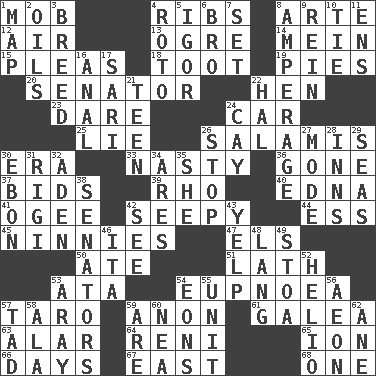 ACROSS 1. Crowd into 4. Teases 8. Johnson of "Laugh-In" 12. Wind 13. Legendary monster 14. Count _ (2 wds.) 15. Entreaties 18. A blast of a horn 19. Sliced desserts 20. Elected representative 22. Layer 23. Have the gumption 24. 4-wheeled motor vehicle 25. Whopper 26. Deli grouping 30. Epoch 33. Smutty 36. Went 37. Auction offers 39. 17th letter of the Greek alphabet 40. Pulitzer Prize-winning author Ferber 41. Double curve, resembling the letter S 42. Not well drained, as in land 44. Curvy letter 45. Simpletons 47. Raised railways 50. Had dinner 51. Thin strip of wood or metal 53. _ moment's notice (2 wds.) 54. Normal relaxed breathing 57. Pacific island yam 59. Soon (poet.) 61. An organ shaped like a helmet 63. Having or resembling wings 64. Painter Guido (1575-1642) 65. Electrically charged atom 66. 24-hour periods 67. Compass direction 68. Single DOWN 1. Atlas unit 2. Lubricates 3. A special lineage 4. Printing process, for short 5. Composer Stravinsky 6. Sis' sibling 7. Put into a specified state 8. Electrical Measurement 9. It's straight from the horse's mouth 10. Neckwear 11. Followers of ems 16. Of or related to the anus 17. Indian skirt 21. Adolescent 22. Actor Linden 24. Island 26. Cease 27. Method 28. Taverns 29. Oceans 30. Inky black, to poets 31. Swiss mountan, "Queen of the Mountains" 32. Arabian gulf 34. Ancient Greek god of war 35. A female animal or person 38. Elected representatives 42. Perceive with the eye 43. Sharp bark 46. Call ___ day 48. Long (Scottish) 49. Portico 52. Sun: prefix 53. Like ___ of sunshine 54. Immeasurably long periods of time 55. A single undivided whole 56. A really long time 57. Small amount or degree 58. In the manner of 59. "We ___ not amused" (Victoria) 60. Teachers' org. 62. A saturated hydrocarbon