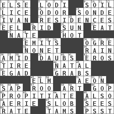 ACROSS 1. Otherwise 5. Farming town in central California 9. Land 13. Louse (plural) 14. Scent 15. Message 16. _ the terrible 17. Dwellings 19. Snakelike fish 20. To free from 21. Player for Phoenix 22. Ingest 23. Nathan's nickname 25. Being at a high temperature 26. Sends forth 30. Legendary monster 34. Music written for nine 35. Water falling in drops from the sky 36. Among 39. Applies to a surface 42. Greek god of love 43. Become fatigued 44. Brizilian seaport 46. Mild oath 47. Takes hold of 48. Shade tree 51. Period of immesurable duration 54. Plant excrement 57. Friend of Pooh 58. Tate display 60. Republican Party 62. Conciliate 65. In addition 66. Nest on high 67. Messy guy 68. Perceives with the eye 69. Pace 70. Scottish caps 71. Inconspicuous attention getter DOWN 1. Writer Wiesel 2. Make or become more lively 3. Any of the three canals of the cochlea 4. Car or cant ending 5. Australian parrot (variant) 6. Wrote a lyric poem 7. Two (Sp.) 8. From or relating to Ireland 9. Male offspring 10. Single time 11. It may be bright or harebrained 12. For fear that 15. Emitted 18. Superhero pair 20. San ____ (Riviera town) 24. Looked after 27. Working for oneself (abbr.) 28. Beverage made from leaves 29. Feeling sharp psychological pain 30. Threatening words 31. Slender fish 32. River (Sp.) 33. Followers of ems 36. Had dinner 37. Russian fighter aircraft 38. Retirement account (abbr.) 40. Drinking establishment 41. R.R. building 45. Blind as ____ 48. One of the Great Lakes 49. Car dealer's back yard 50. Wet 52. Stares at amorously 53. Olfactory organs 54. Practice fight 55. Type of rug 56. Left side of a ship or aircraft 58. Smallest unit of an element 59. Confederate soldiers (slang) 61. Mail 63. Sliced dessert 64. In the manner of 65. Cleo's killer